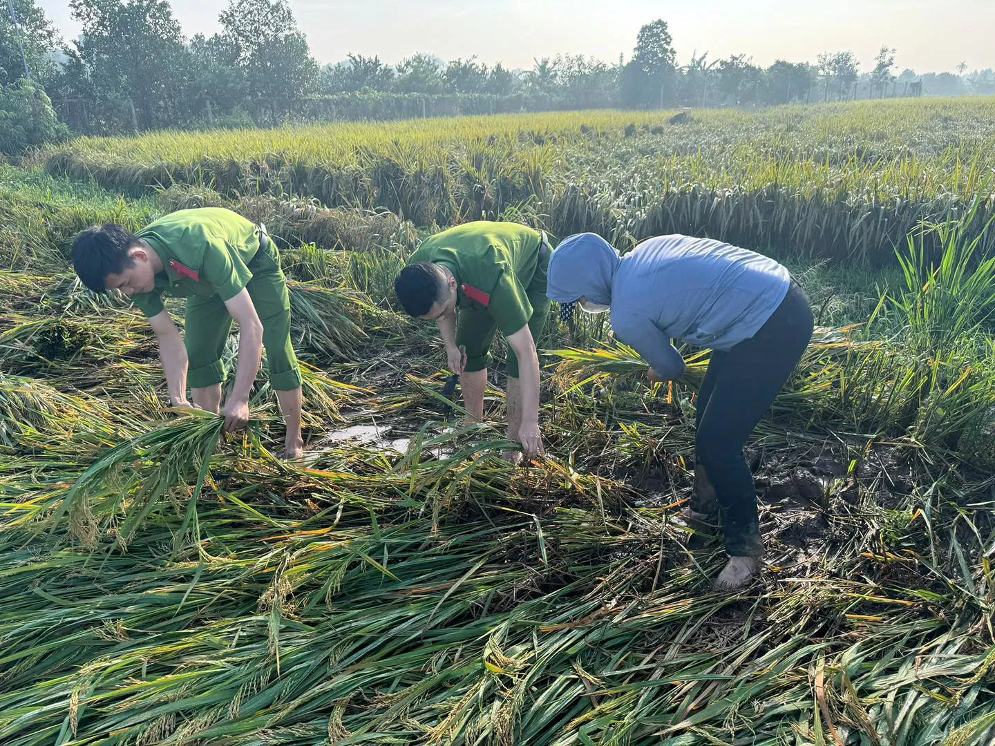 Công an xã Ô Diên hỗ trợ các gia đình có người già, neo đơn, thiếu lao động khẩn trương thu hoạch sớm diện tích lúa gãy đổ.
