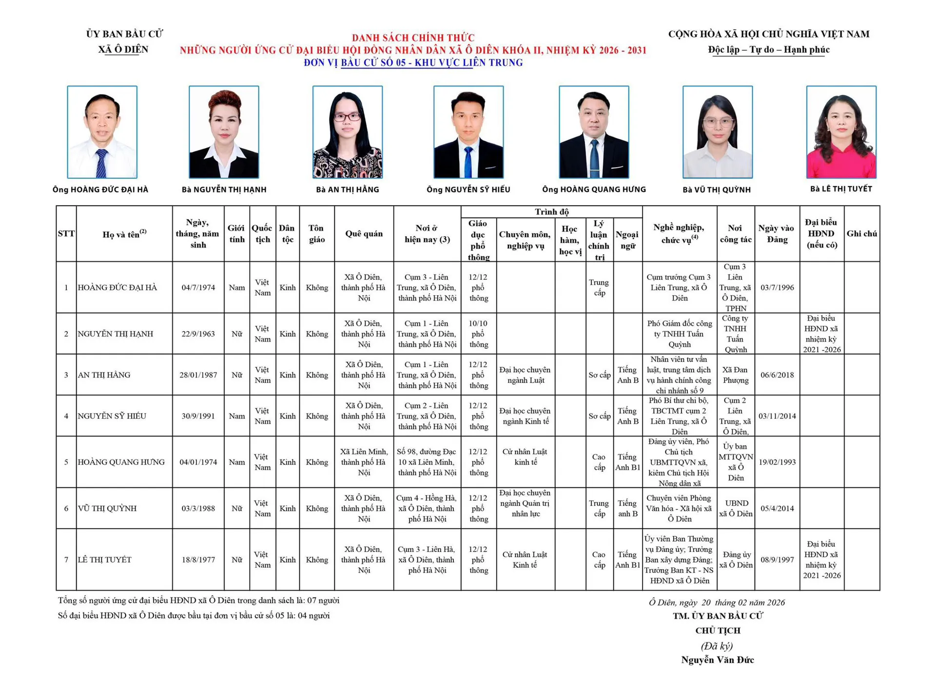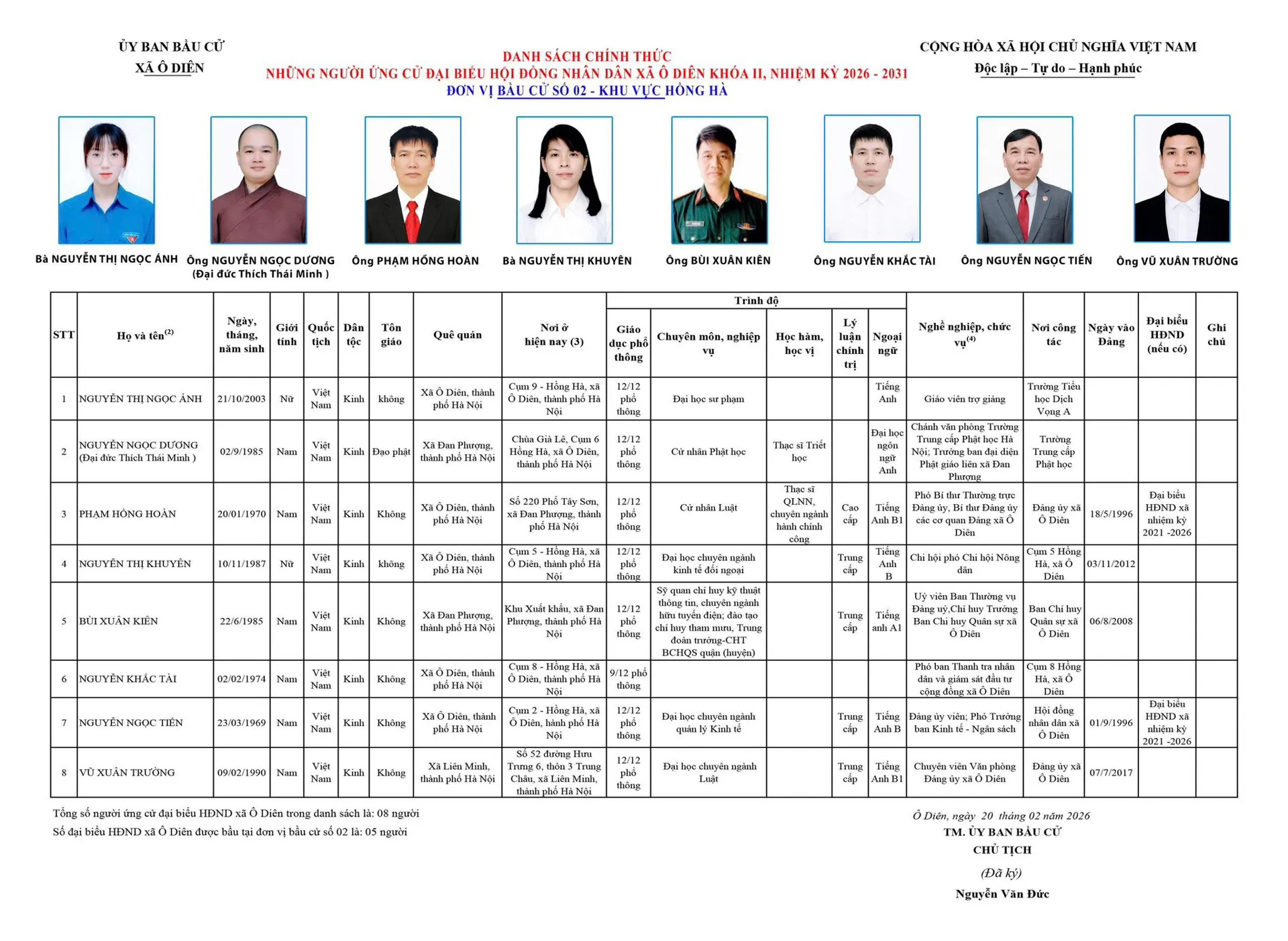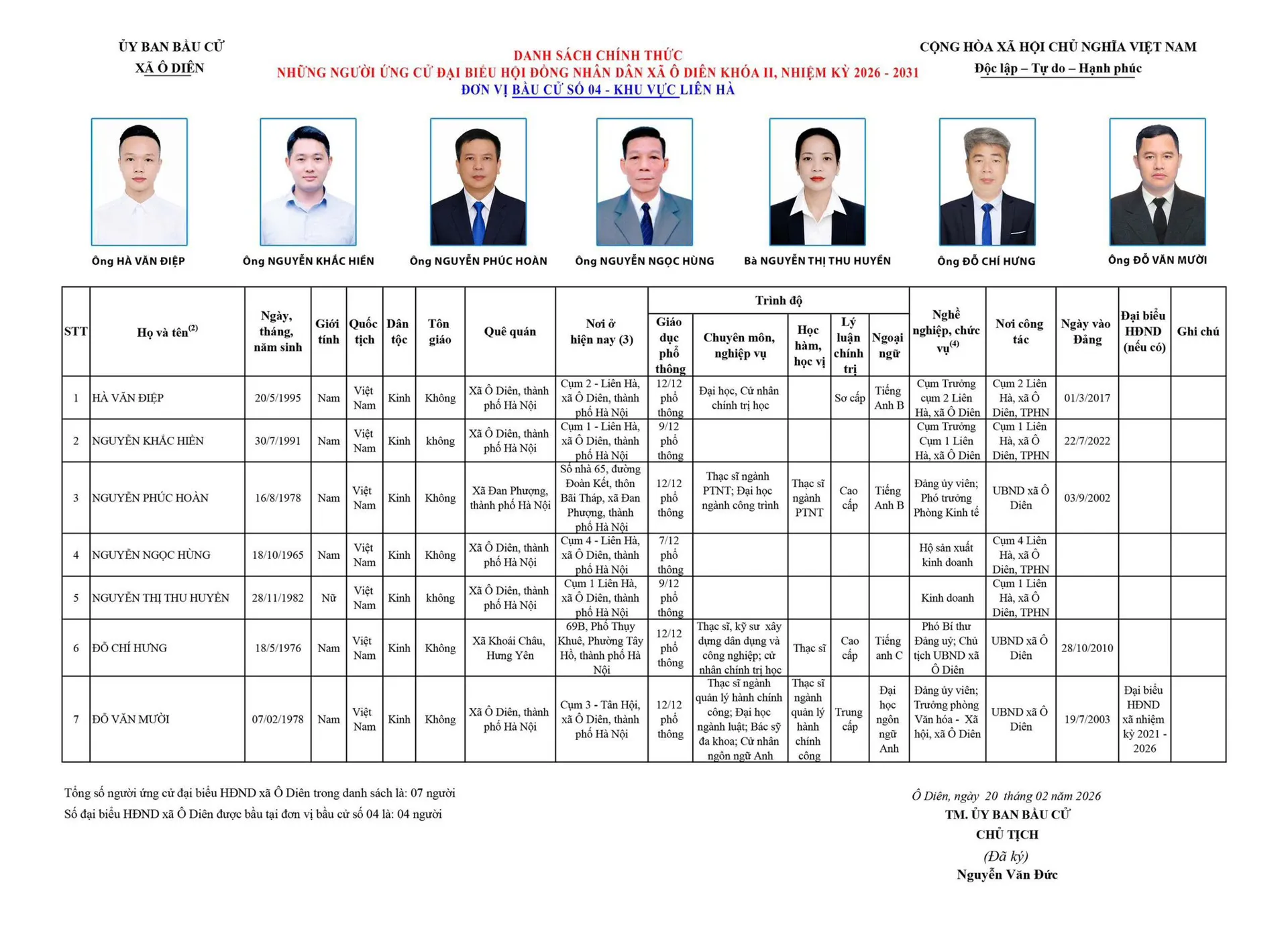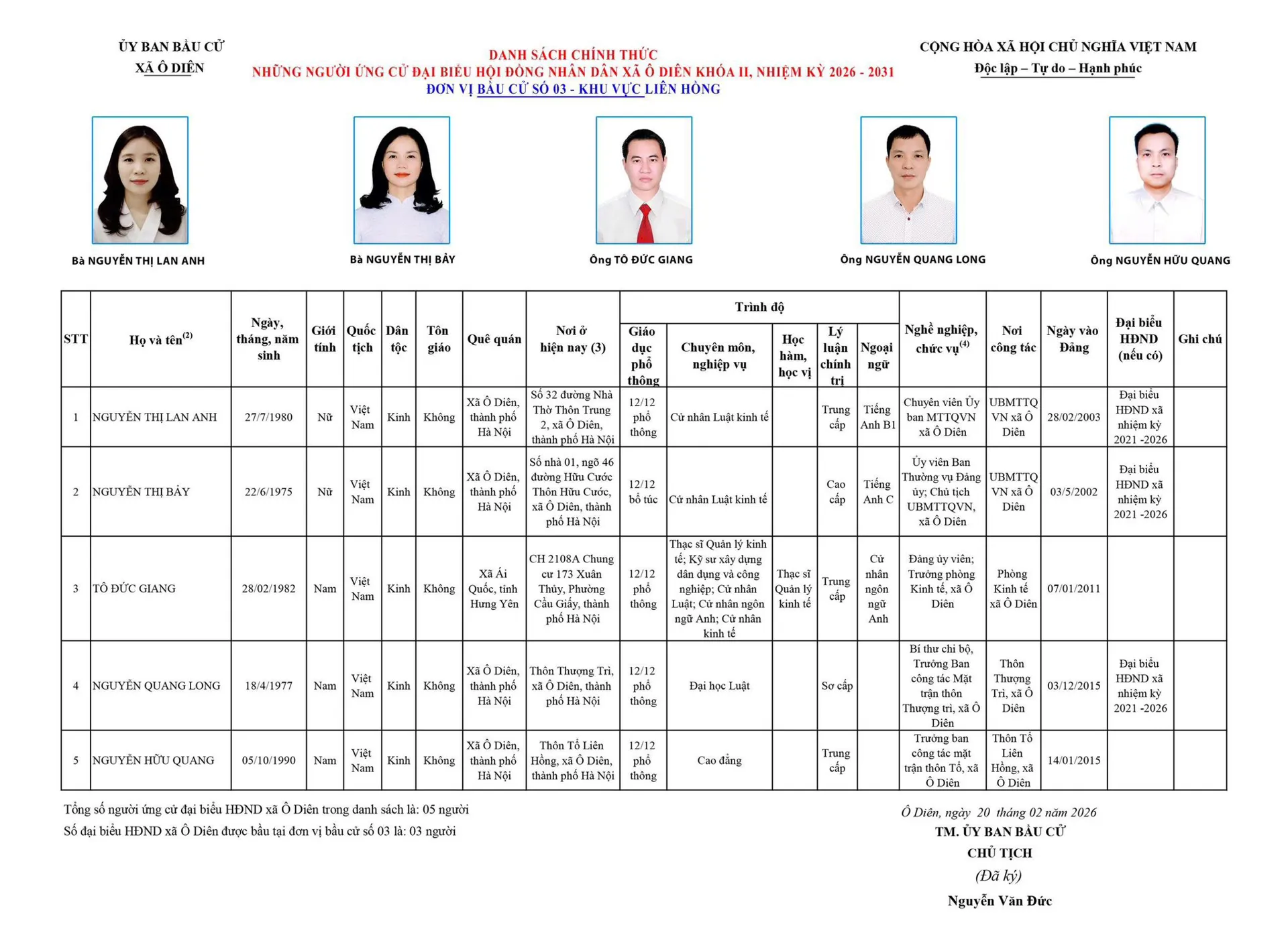 Công bố danh sách chính thức người ứng cử đại biểu HĐND xã Ô Diên nhiệm kỳ 2026 - 2031
