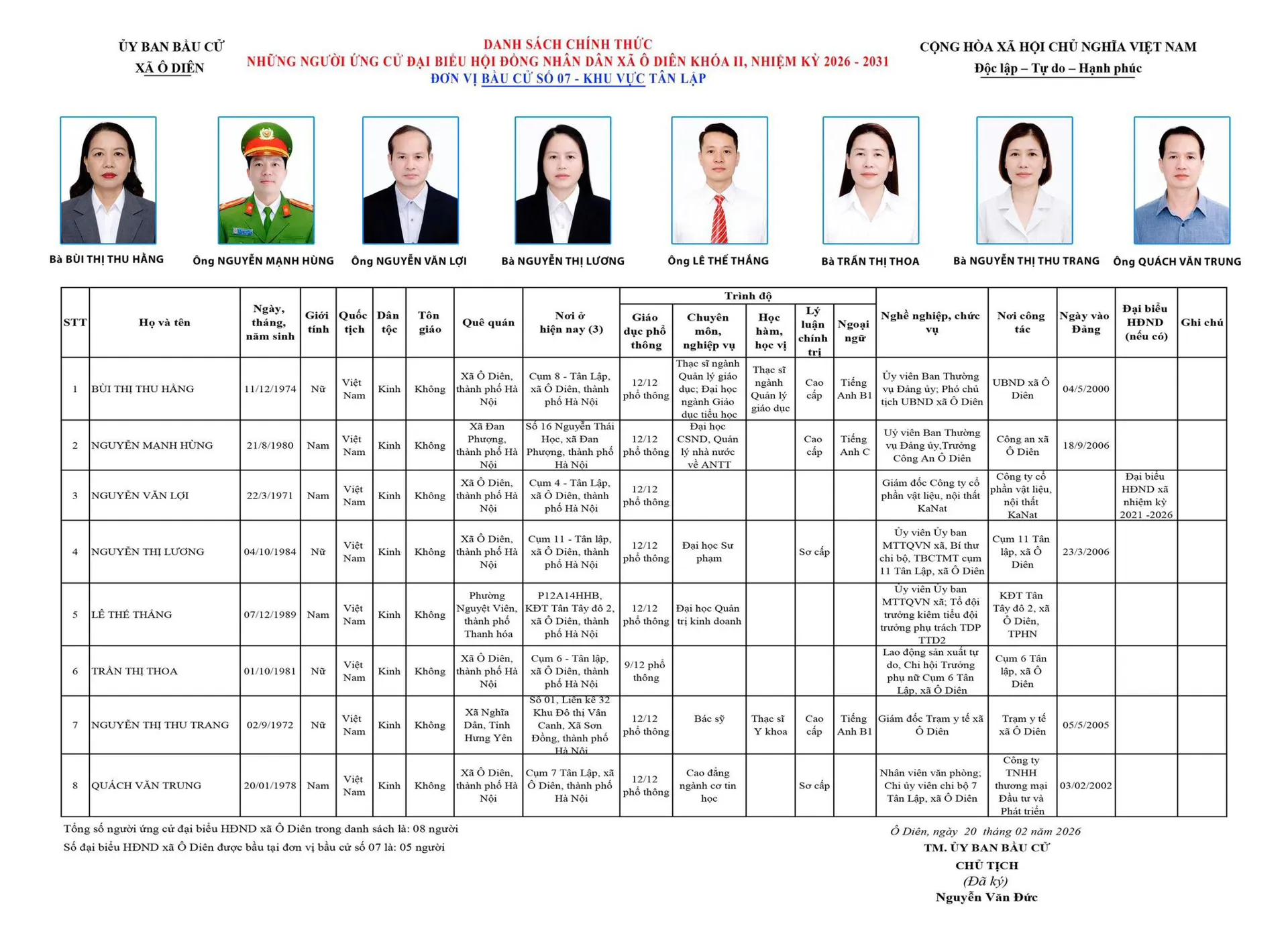 Ủy ban Bầu cử xã Ô Diên vừa công bố danh sách 50 người ứng cử đại biểu HĐND xã nhiệm kỳ 2026 - 2031 tại 7 đơn vị bầu cử trên địa bàn xã để bầu 30 đại biểu HĐND xã khóa mới.