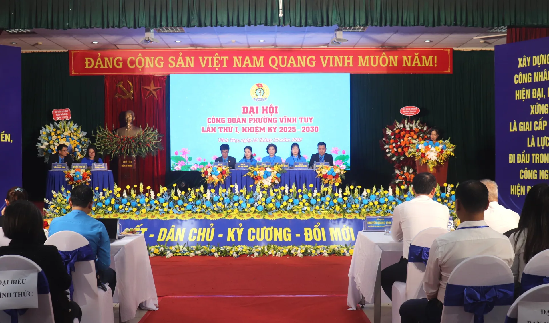 Với chủ đề “Đoàn kết - Dân chủ - Kỷ cương - Đổi mới - Phát triển”, Đại hội Công đoàn phường Vĩnh Tuy lần thứ I đã thực hiện các nội dung: đánh giá kết quả hoạt động của Công đoàn phường Vĩnh Tuy trong thời gian qua và xác định phương hướng, nhiệm vụ nhiệm kỳ 2025-2030; tiếp thu 2 ý kiến tham luận; báo cáo tổng hợp ý kiến đóng góp vào dự thảo Báo cáo của Ban Chấp hành LĐLĐ TP khóa XVII trình Đại hội Công đoàn TP Hà Nội lần thứ XVIII, nhiệm kỳ 2025 - 2030...