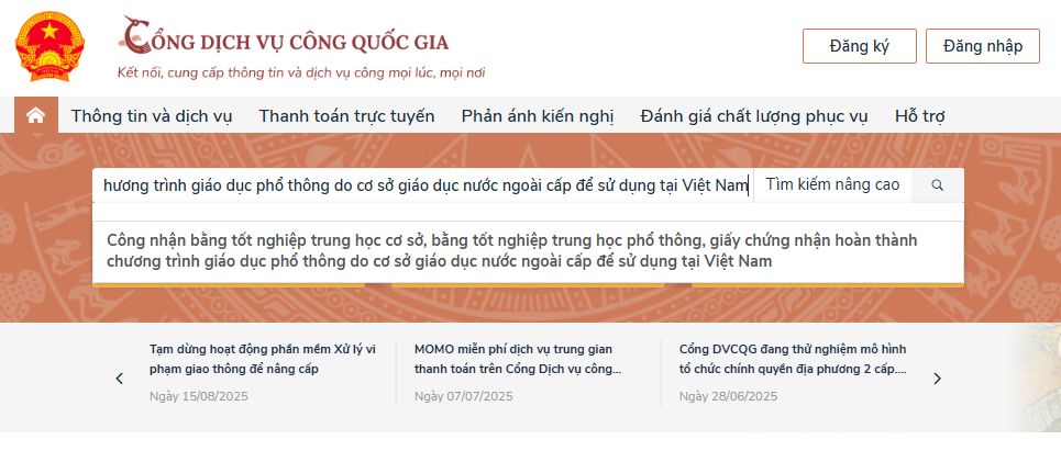 Gõ từ khóa tìm kiếm, công nhận bằng tốt nghiệp và lựa chọn thủ tục “Công nhận bằng tốt nghiệp trung học cơ sở, bằng tốt nghiệp trung học phổ thông, giấy chứng nhận hoàn thành chương trình giáo dục phổ thông do cơ sở giáo dục nước ngoài cấp để sử dụng tại Việt Nam”.