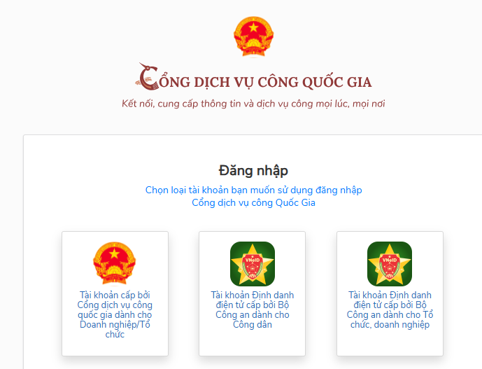 Công dân thực hiện đăng nhập bằng tài khoản định danh điện tử cấp bởi Bộ Công an dành cho công dân.
