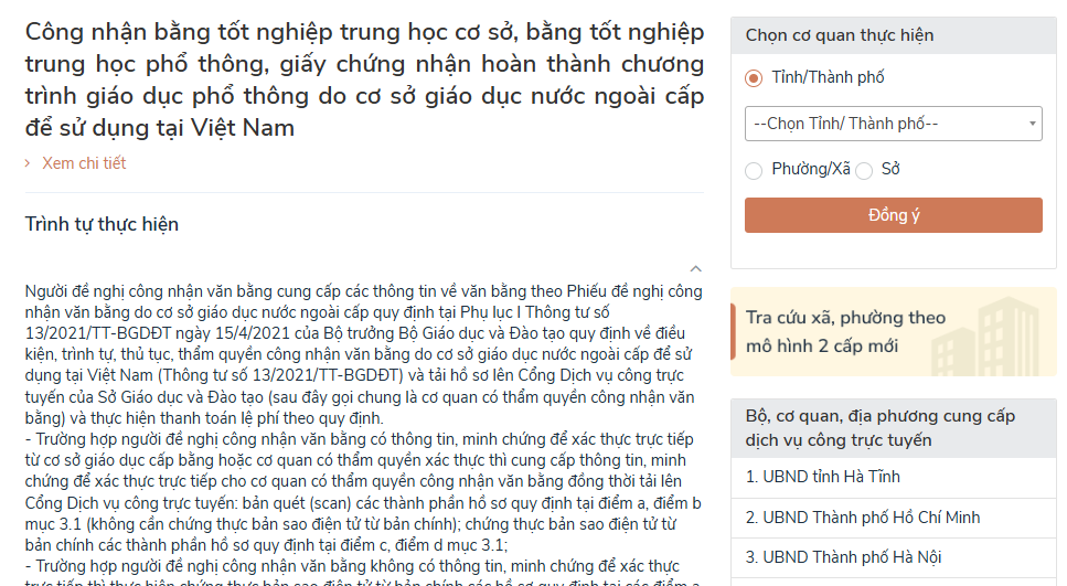 Tại phần cơ quan thực hiện, Công dân chọn tỉnh thành phố phù hợp, chọn Sở Giáo dục và Đào tạo, nhấn đồng ý. Lúc này hiện ra danh sách dịch vụ công gồm các thủ tục hành chính. Công dân chọn trường hợp đầu tiên, bấm nộp trực tuyến.