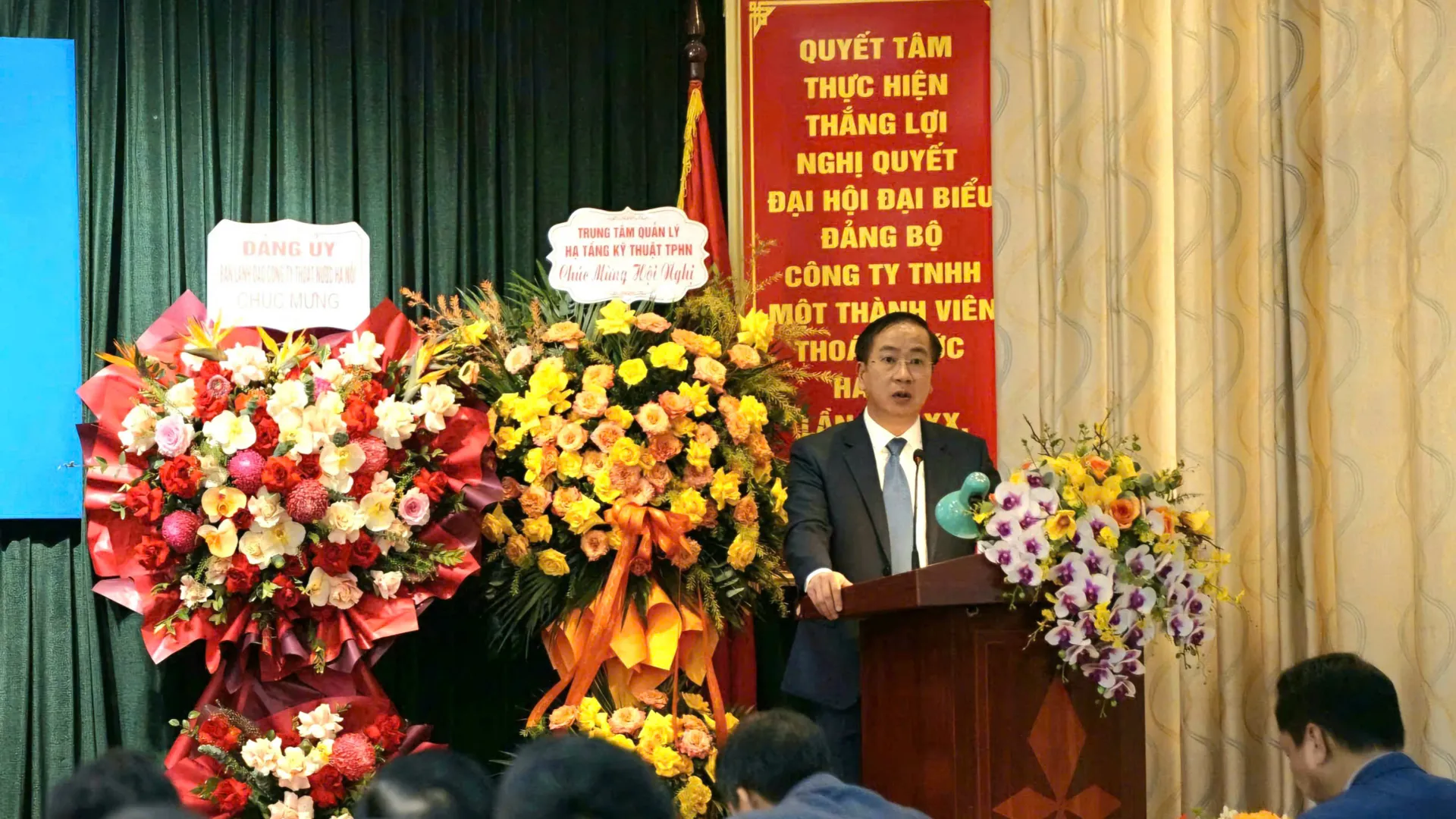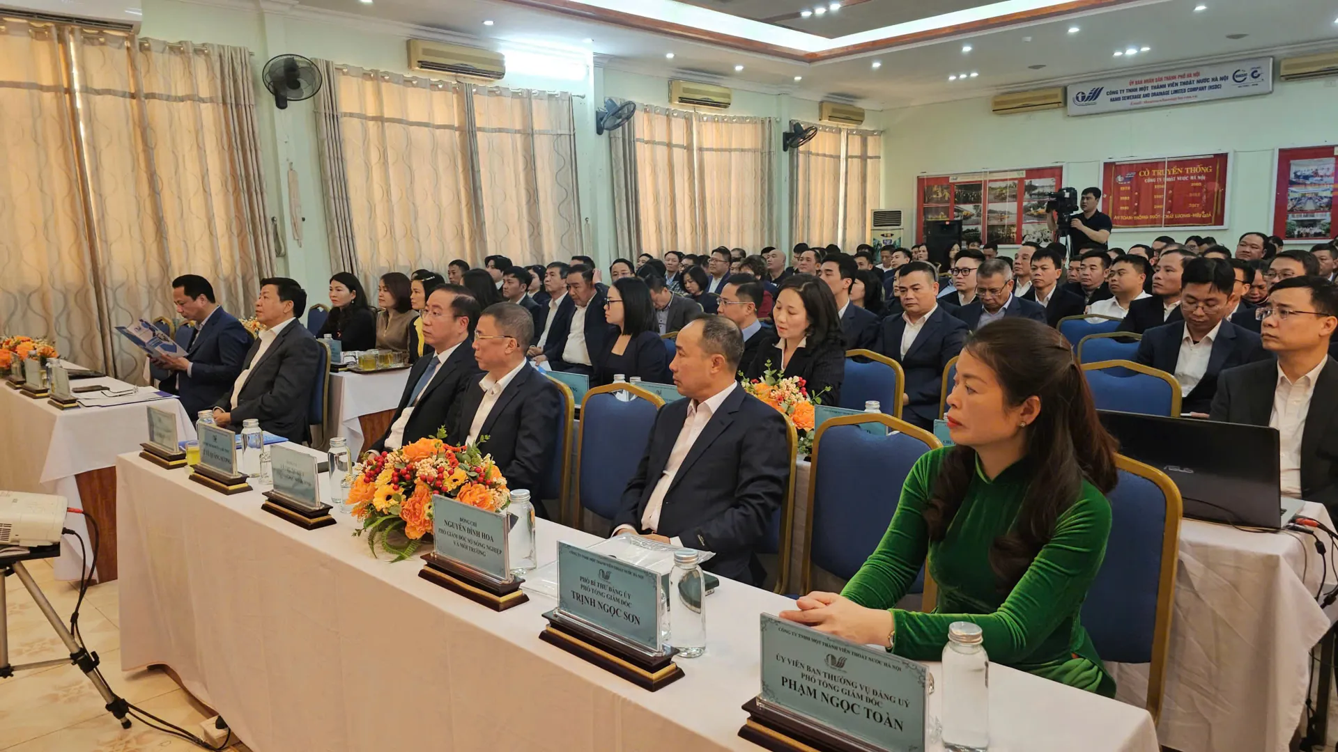 Phó Chủ tịch Thường trực UBND TP Hà Nội Dương Đức Tuấn và các đại biểu dự hội nghị tổng kết công tác năm 2025, triển khai phương hướng nhiệm vụ năm 2026 của Công ty TNHH MTV Thoát nước Hà Nội.