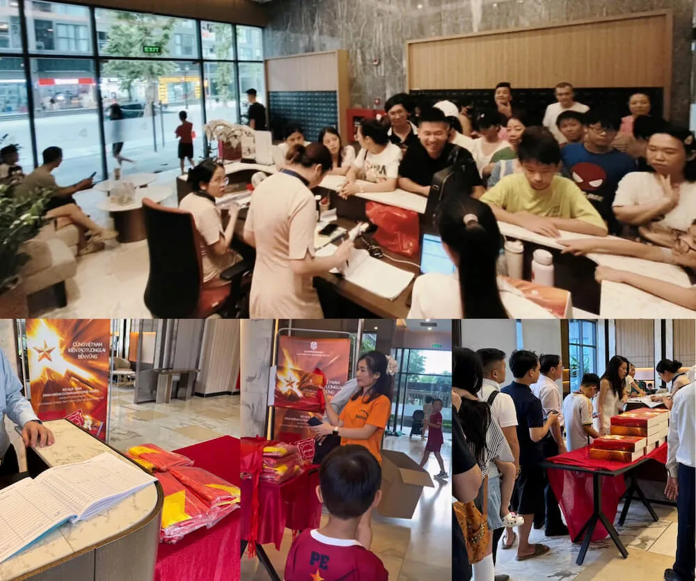 Chương trình tặng quà “Yêu nước” được khởi động từ 18/8/2025, lan tỏa đồng loạt tại các dự án của Masterise Homes ở Hà Nội và TP. Hồ Chí Minh bao gồm Masteri West Heights, Masteri Waterfront, Masteri Centre Point, Lumière Boulevard, Lumière Riverside và The Global City – Soho. Hơn 10.000 bộ quà “Yêu Nước” đã được trao tận tay cư dân tại khu vực lễ tân của từng dự án, đồng thời Ban quản lý cũng trực tiếp đến từng căn hộ để hỗ trợ treo cờ Tổ quốc, góp phần phủ đỏ không gian sống Masterise Homes trong dịp lễ trọng đại của đất nước.