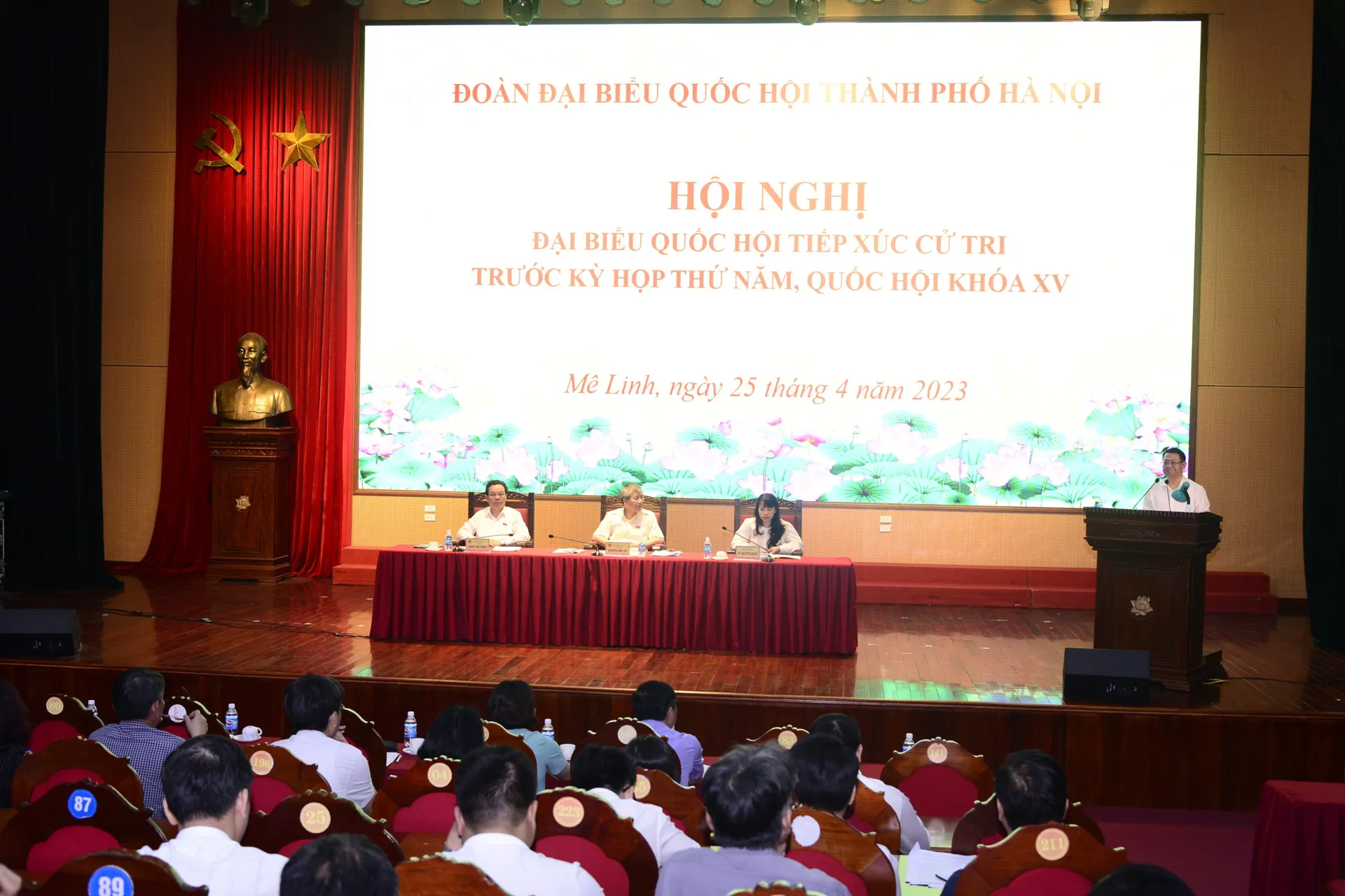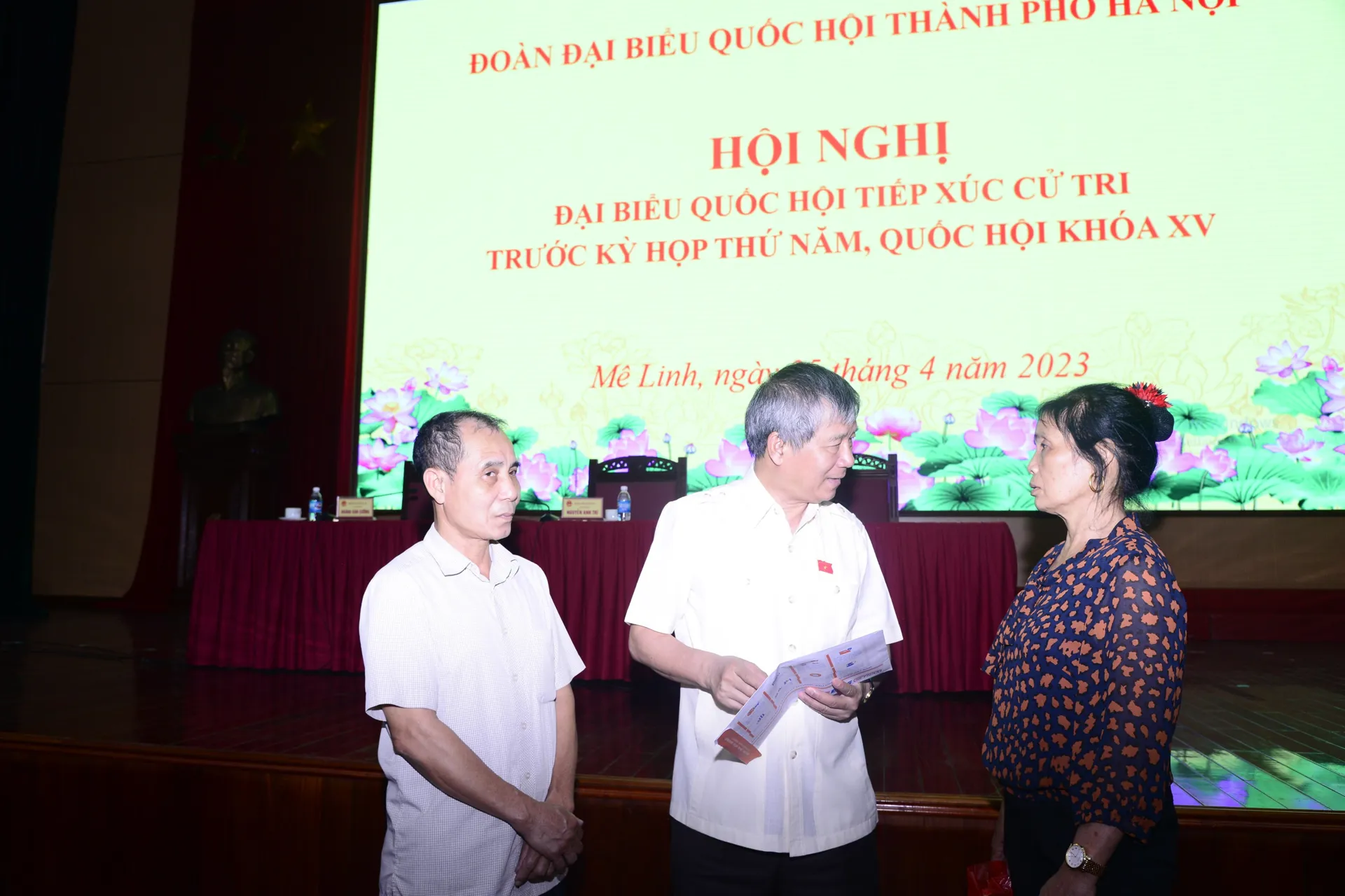 Sau khi nghe các đại biểu Quốc hội thông tin về dự kiến nội dung, thời gian, chương trình kỳ họp thứ năm, Quốc hội khóa XV và báo cáo trả lời kiến nghị của cử tri, cử tri huyện Mê Linh đã phản ánh, kiến nghị về một số nội dung liên quan đến công tác xây dựng luật, bảo đảm quyền lợi về đất đai, xử lý tồn tại tại các khu công nghiệp...