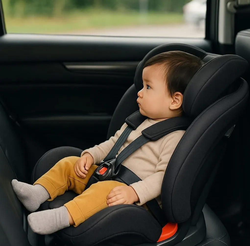 Người dân có thể sử dụng đai trẻ em, ghế trẻ em hoặc đệm trẻ em trên ô tô phù hợp với điều kiện của trẻ, của gia đình và phù hợp với điều kiện sử dụng trên ô tô. Ảnh AI.