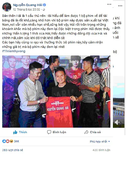 Và còn gì tuyệt vời hơn, khi chính bạn sẽ được trải qua cảm xúc khó diễn tả mà cầu thủ U23 Việt Nam Quang Hải nói đến ấy. Rất đơn giản, cứ truy cập trên kênh youtube (link: https://www.youtube.com/watch?v=_AtfNi-R6nE) là có thể xem được miễn phí toàn bộ bản HD của bộ phim “11 Niềm hy vọng” của nhà sản xuất và đạo diễn Robbie Trường quyết định dành tặng người đam mê điện ảnh và bóng đá.