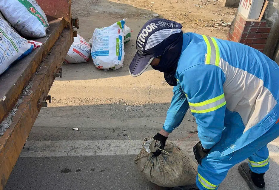 Công nhân vệ sinh môi trường dọn dẹp rác thải xây dựng bị đổ trộm ra đường.