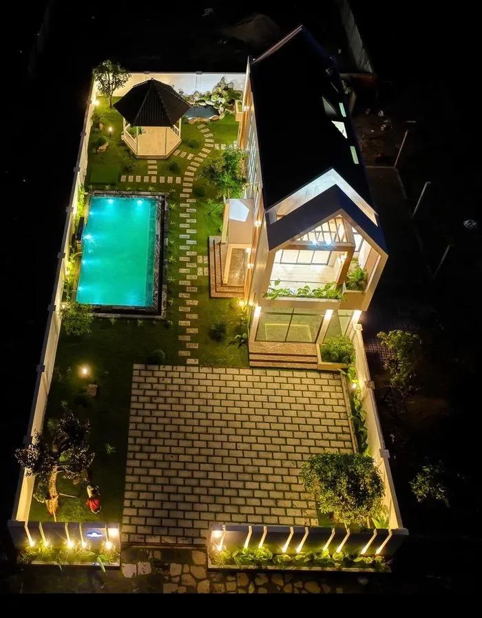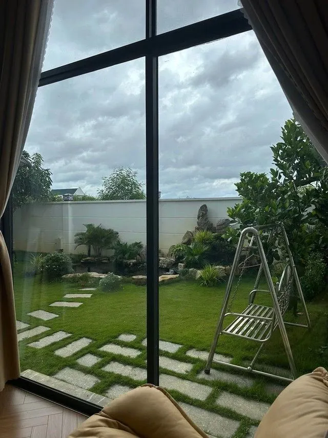 Theo chia sẻ, biệt thự được xây dựng trên khu đất có diện tích khoảng 600 m², hoàn thiện trong gần 5 tháng. Thay vì lựa chọn lối kiến trúc đồ sộ, Lê Giang ưu tiên một công trình vừa đủ ở, chú trọng sự thoáng đãng và cảm giác thư thái. Phần lớn diện tích được dành cho sân vườn, hồ bơi, hồ cá, hòn non bộ cùng nhiều loại cây xanh và cây ăn trái, tạo nên tổng thể xanh mát, yên bình.