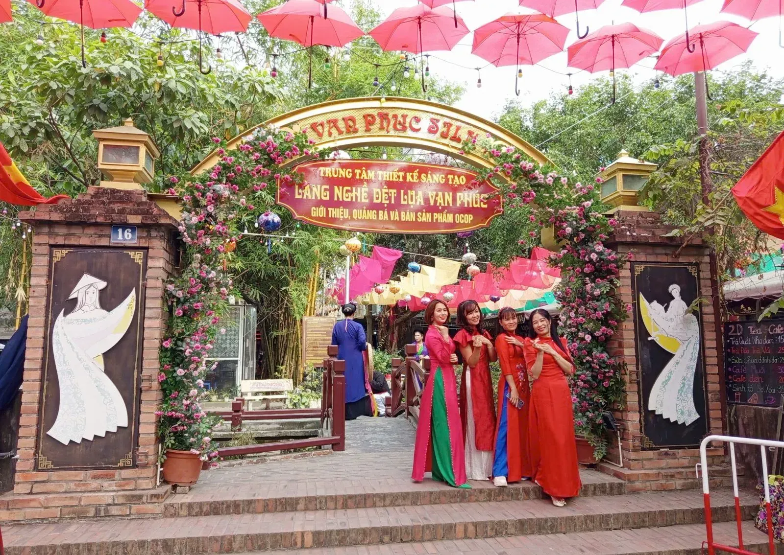 Chị em phụ nữ thích thú chụp ảnh tại không gian của Tuần lễ Văn hóa - Du lịch - Thương mại làng nghề Vạn Phúc 2024. Ảnh: Thu Huyền