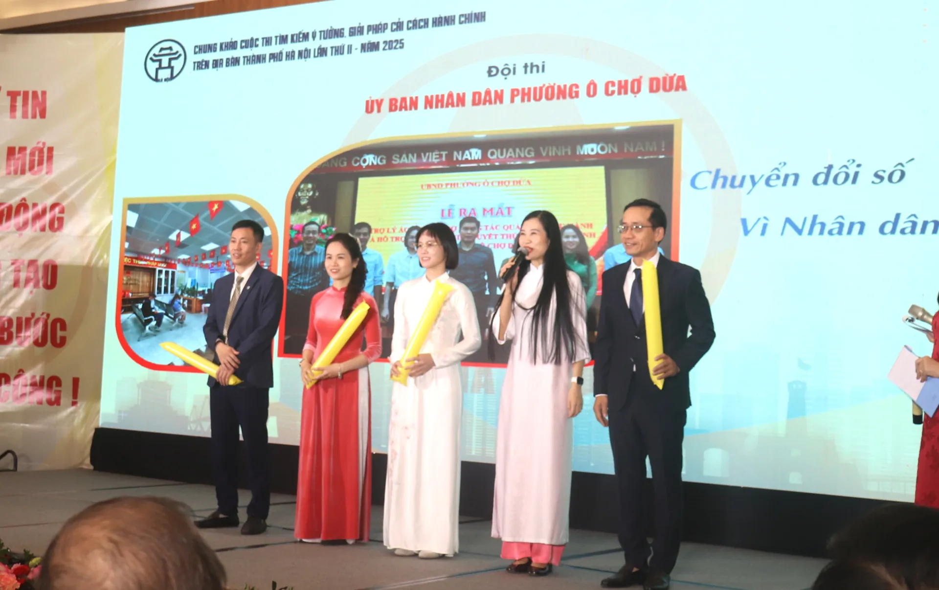 Đến từ phường Ô Chợ Dừa, đội thi trình bày sáng kiến “Ứng dụng Trợ lý AI phường Ô Chợ Dừa trong phục vụ người dân và hỗ trợ cán bộ thực thi công vụ năm 2025”. Theo đó, sáng kiến tập trung triển khai ứng dụng Trợ lý ảo trí tuệ nhân tạo (AI) tại UBND phường Ô Chợ Dừa nhằm hỗ trợ CBCC trong công tác quản lý, điều hành và giải quyết thủ tục hành chính; đồng thời trực tiếp hướng dẫn, hỗ trợ người dân thực hiện dịch vụ công trực tuyến.