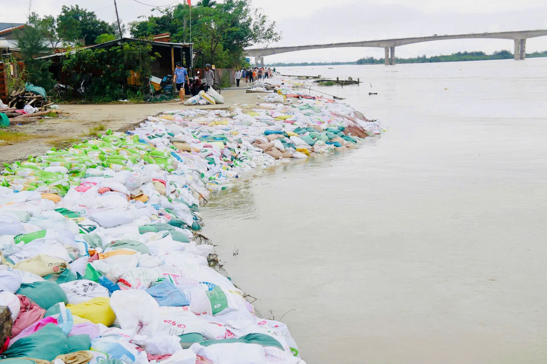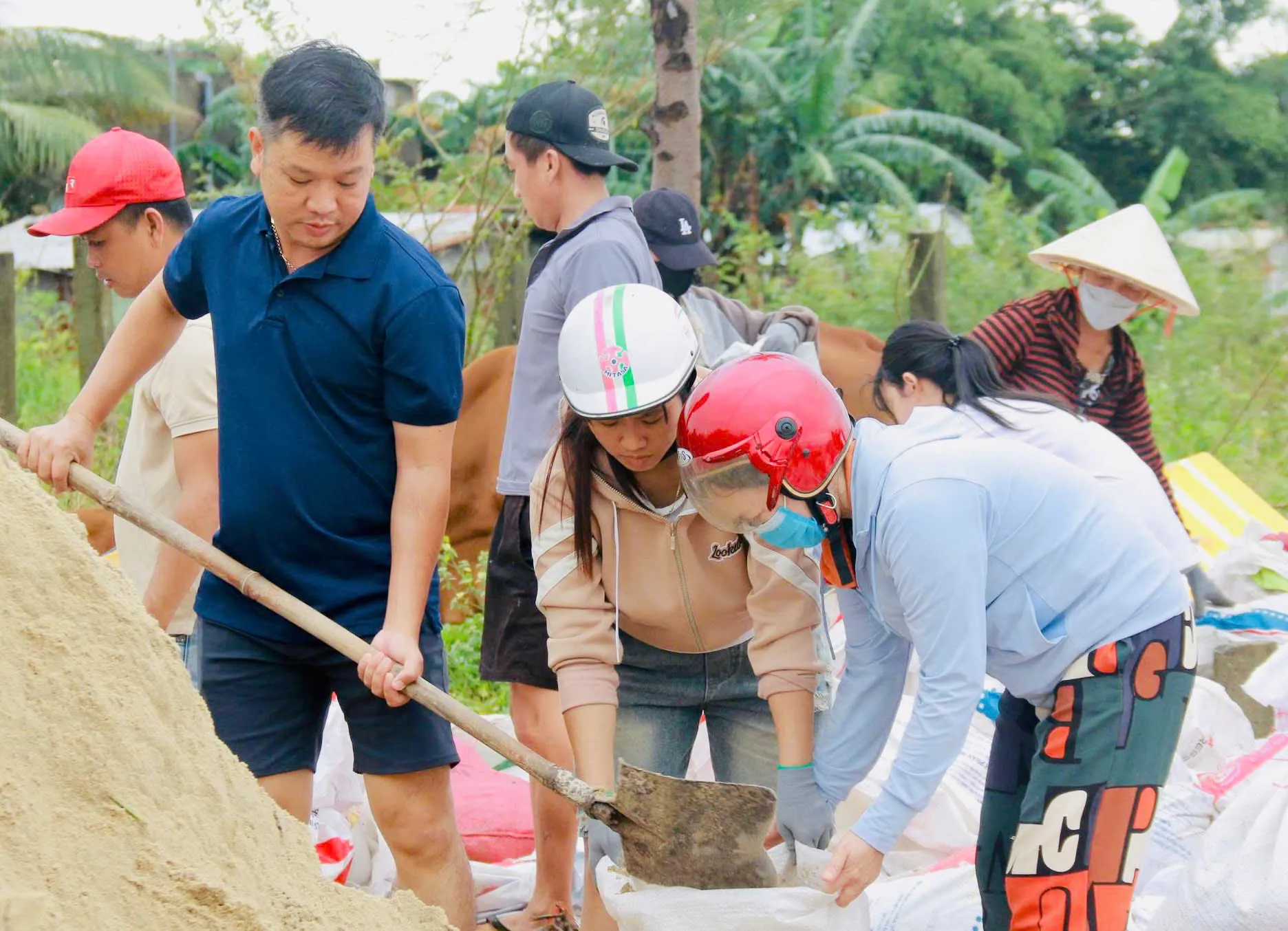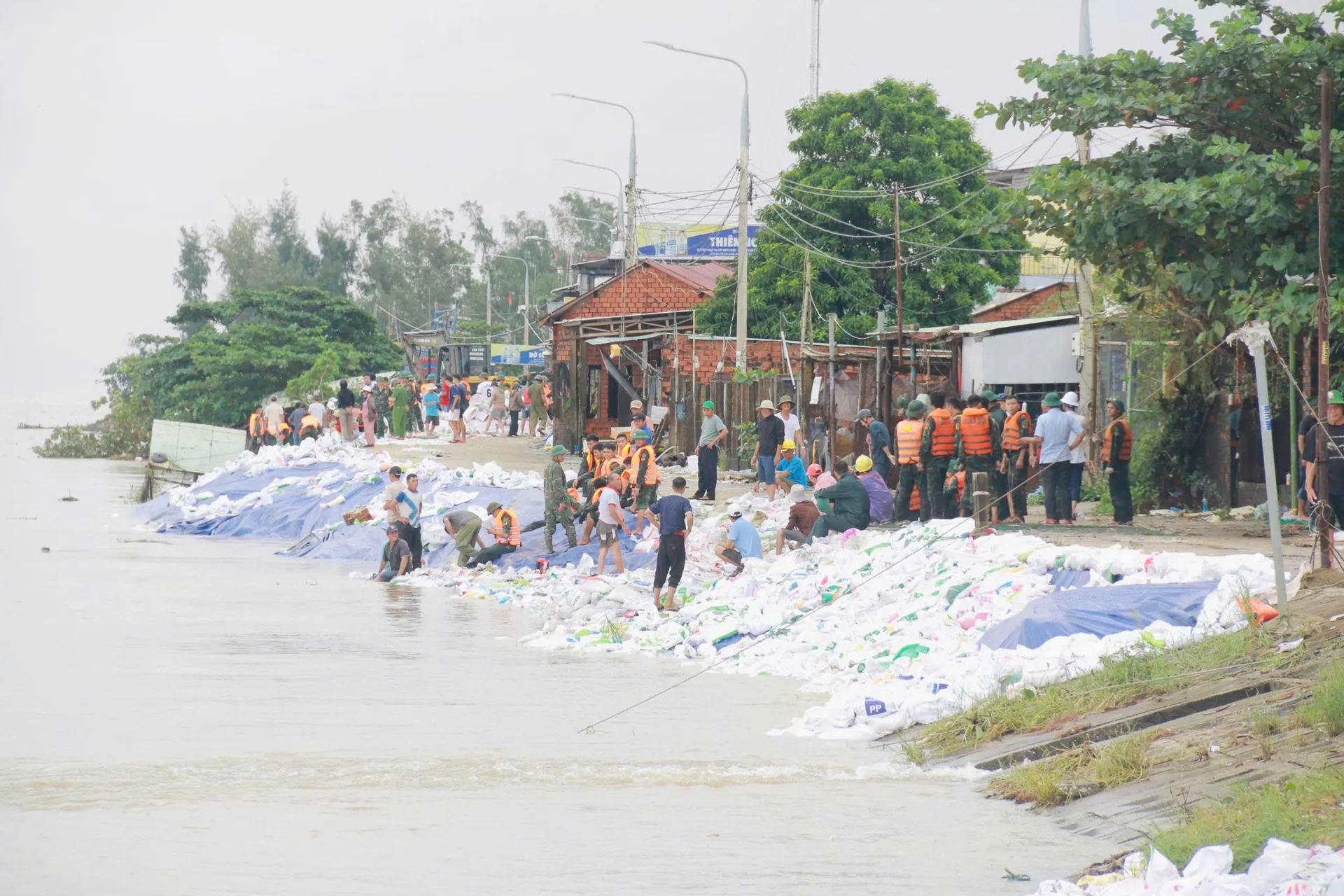 Công tác gia cố được triển khai khẩn trương với sự giúp sức rất lớn từ người dân địa phương. Hàng trăm hộ gia đình tích cực vận chuyển vật tư, hỗ trợ thiết bị và tham gia đổ cát vào bao để chạy đua với thời gian.