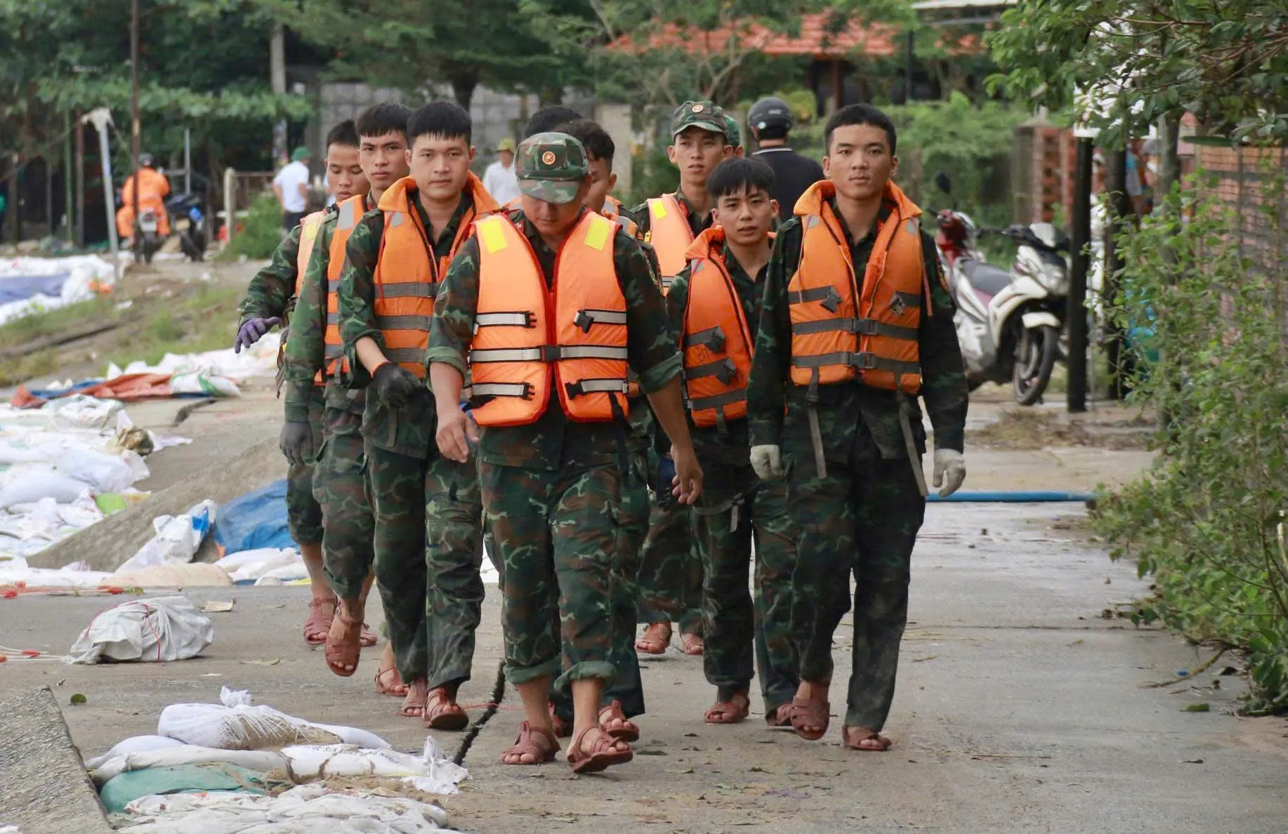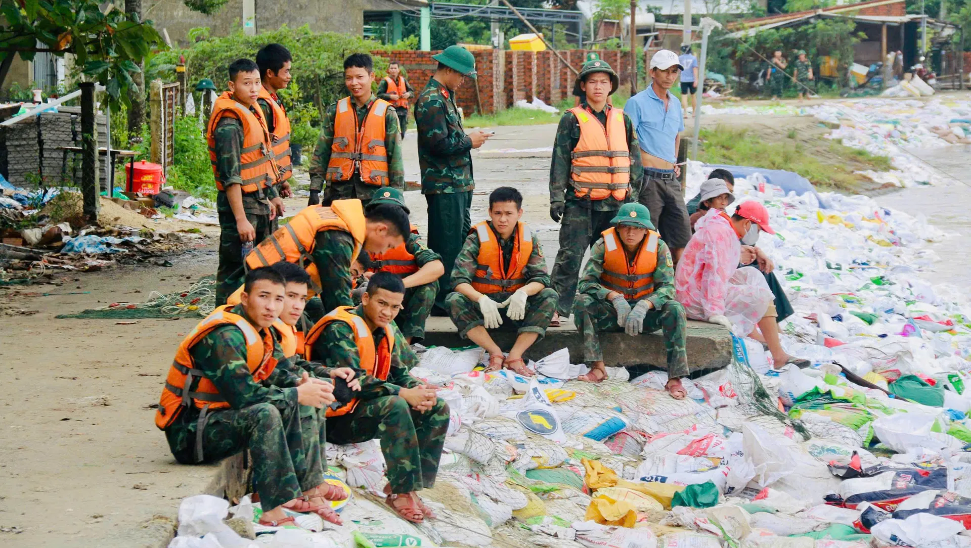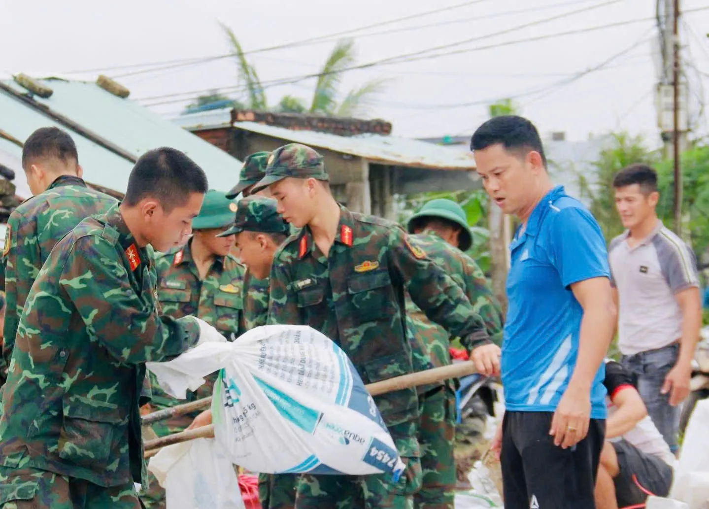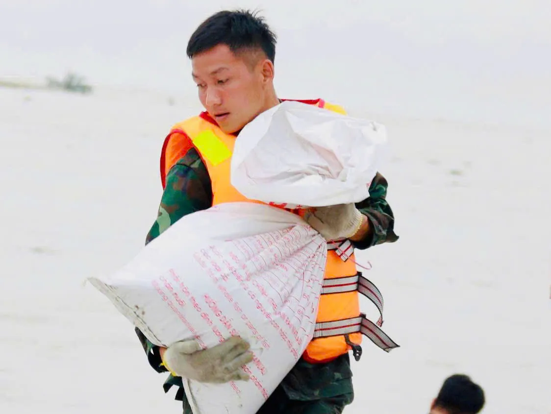 Các chiến sĩ cùng chính quyền và người dân không ngại khó khăn trong điều kiện thời tiết khắc nghiệt, làm việc xuyên đêm để sớm gia cố, bảo vệ tuyến đê.