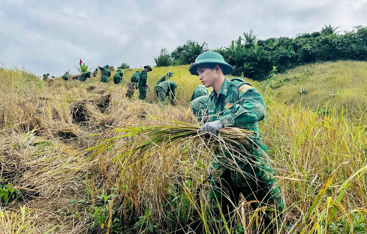 Bộ đội biên phòng giúp dân vùng biên giới thu hoạch lúa trước khi bão vào đất liền.