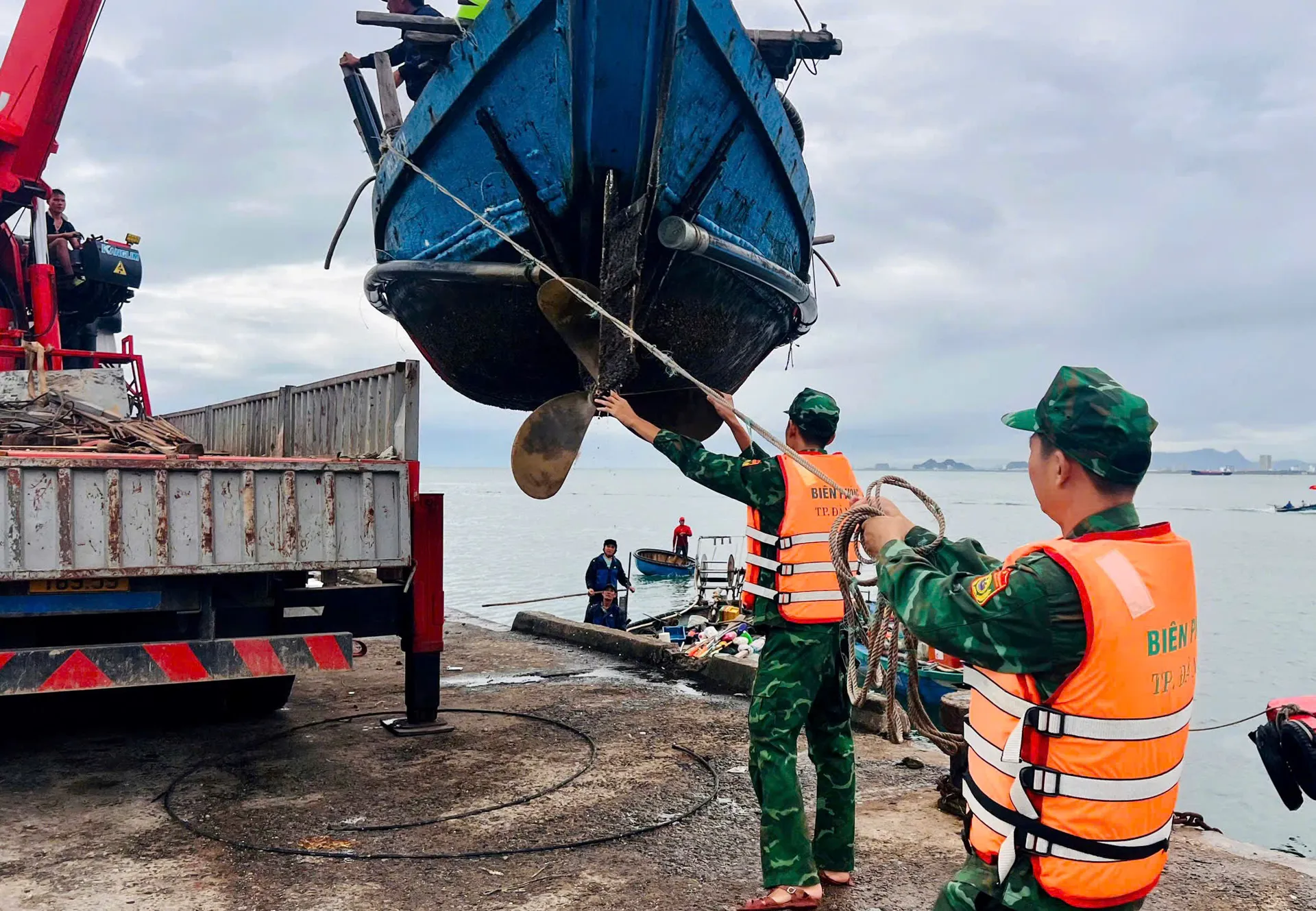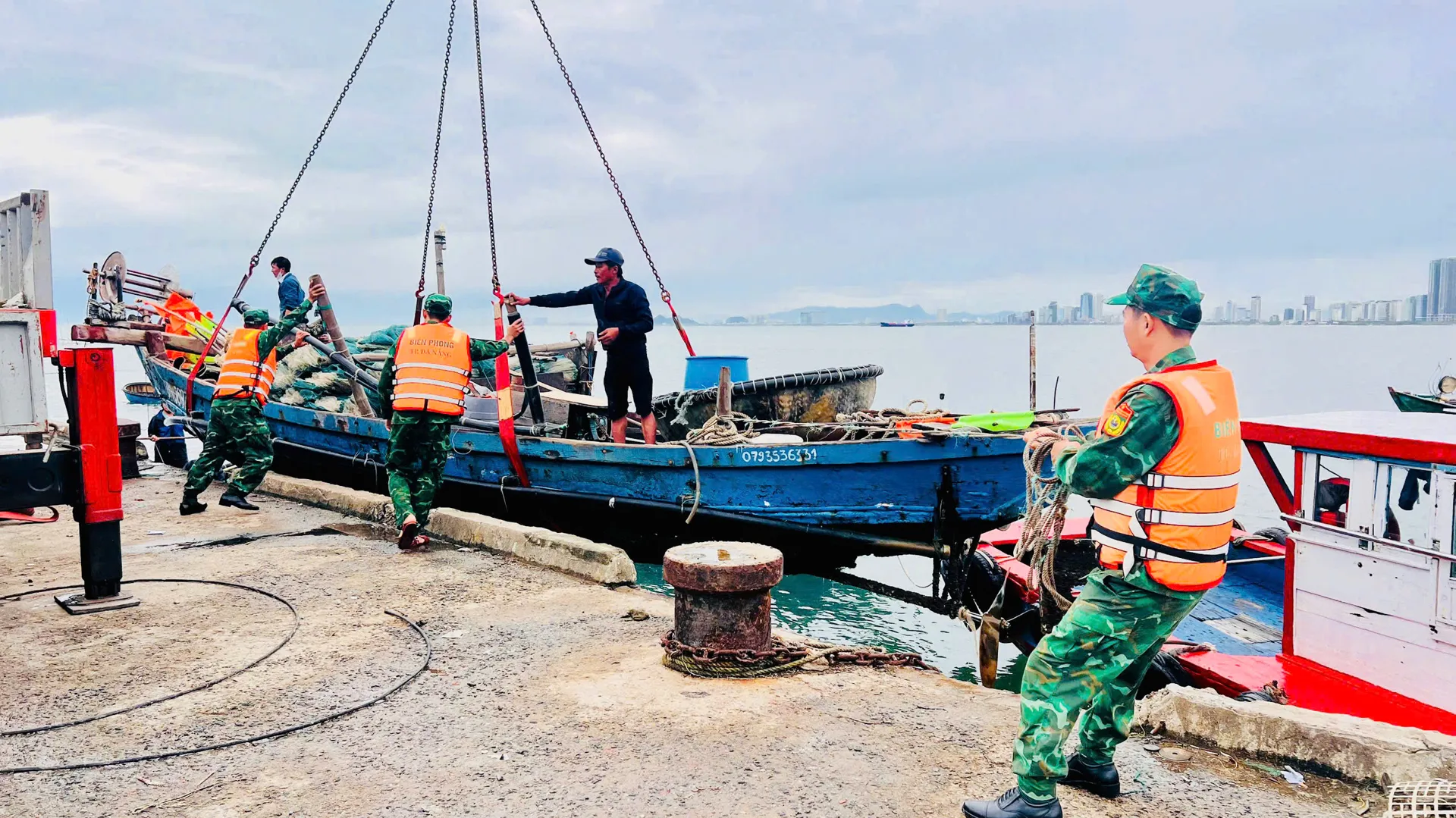 Ngư dân vùng biển được hỗ trợ di dời tàu thuyền vào bờ.