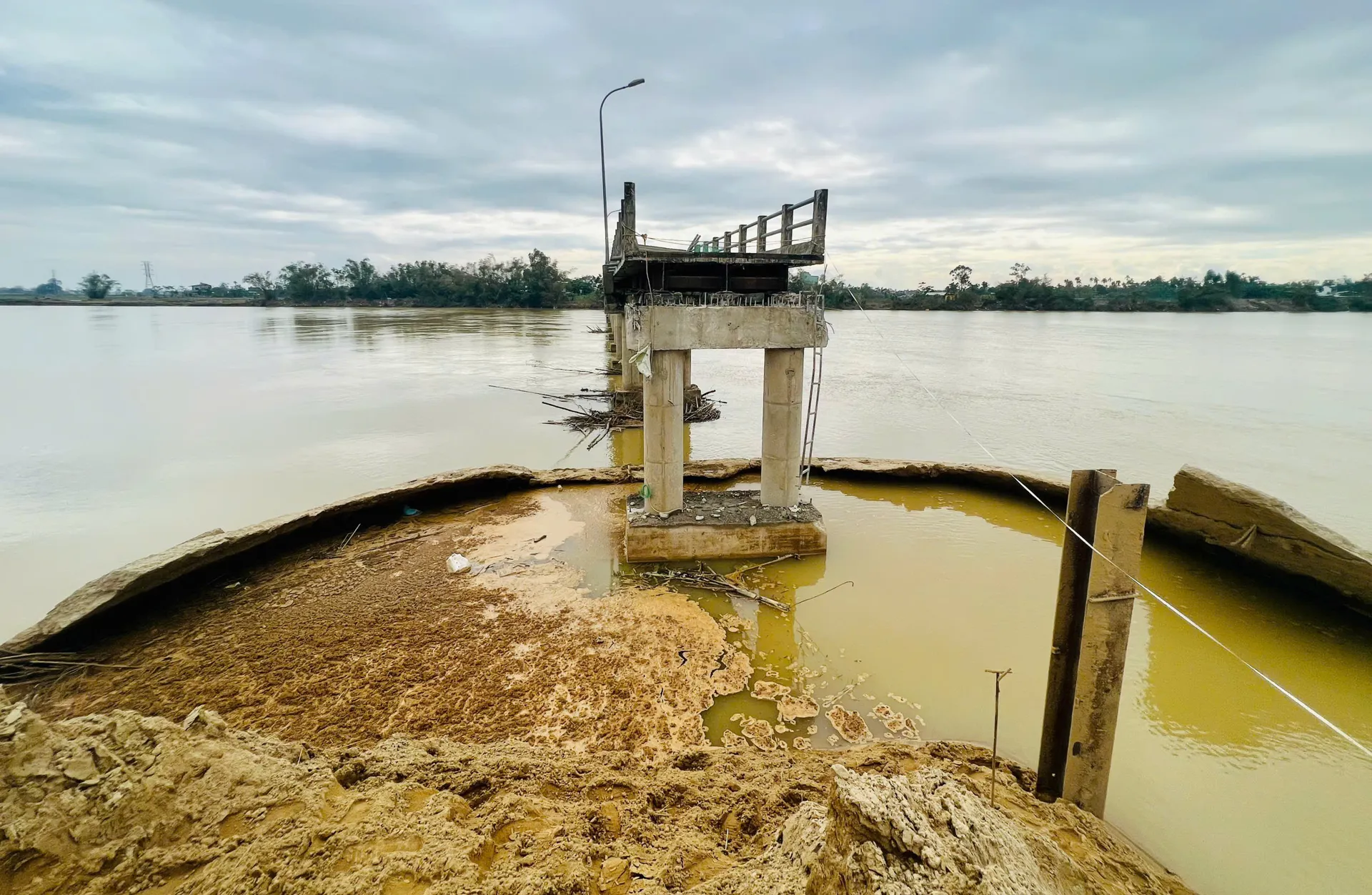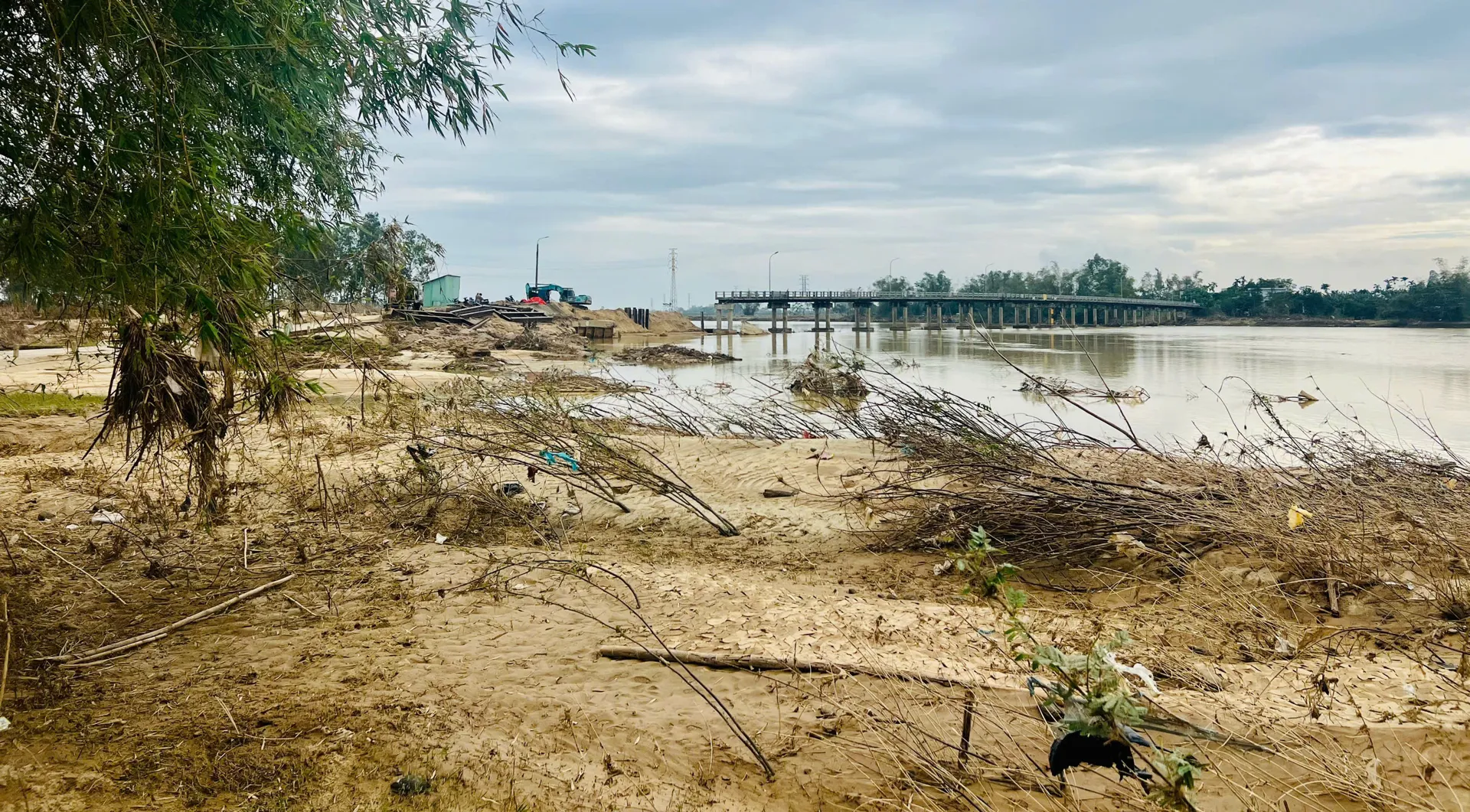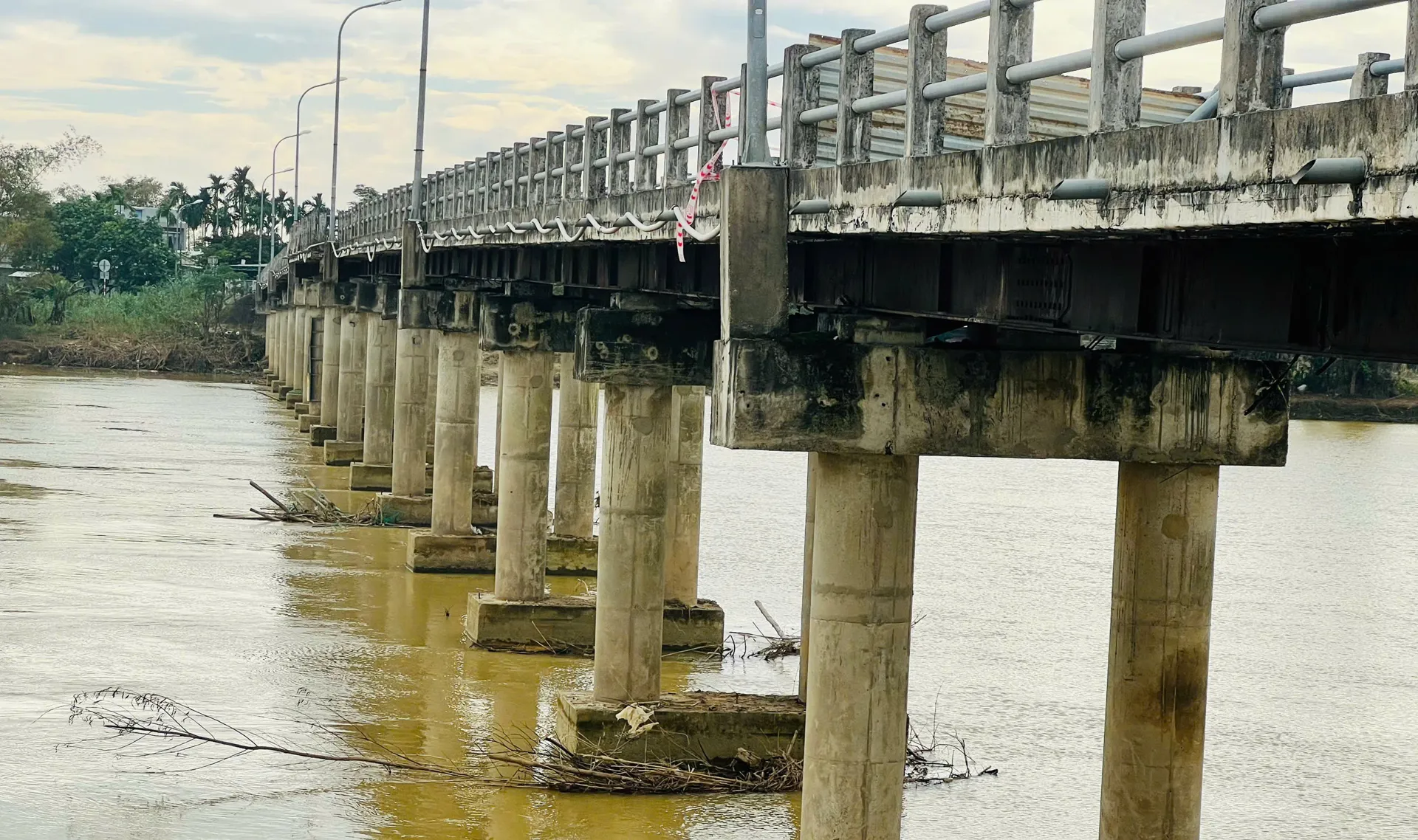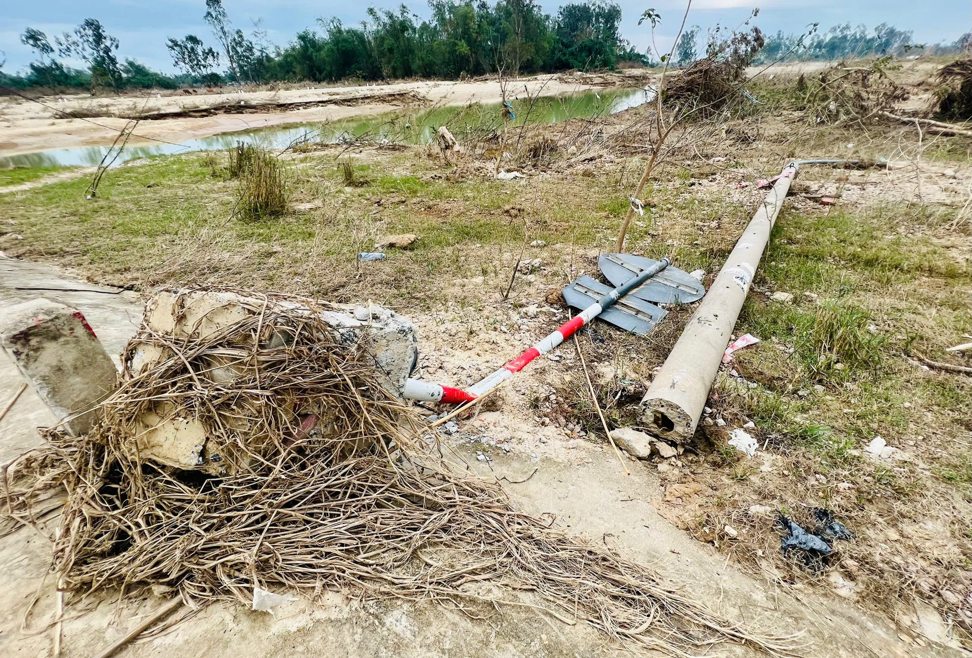 Nước lũ dâng cao còn khiến các hạng mục công trình phụ như đường dẫn, biển báo giao thông, hệ thống đèn chiếu sáng… bị hư hỏng, cuốn trôi. Lượng lớn đất cát, rác thải vẫn còn nguyên tại những điểm thấp, vùng trũng ven sông, dưới chân cầu.