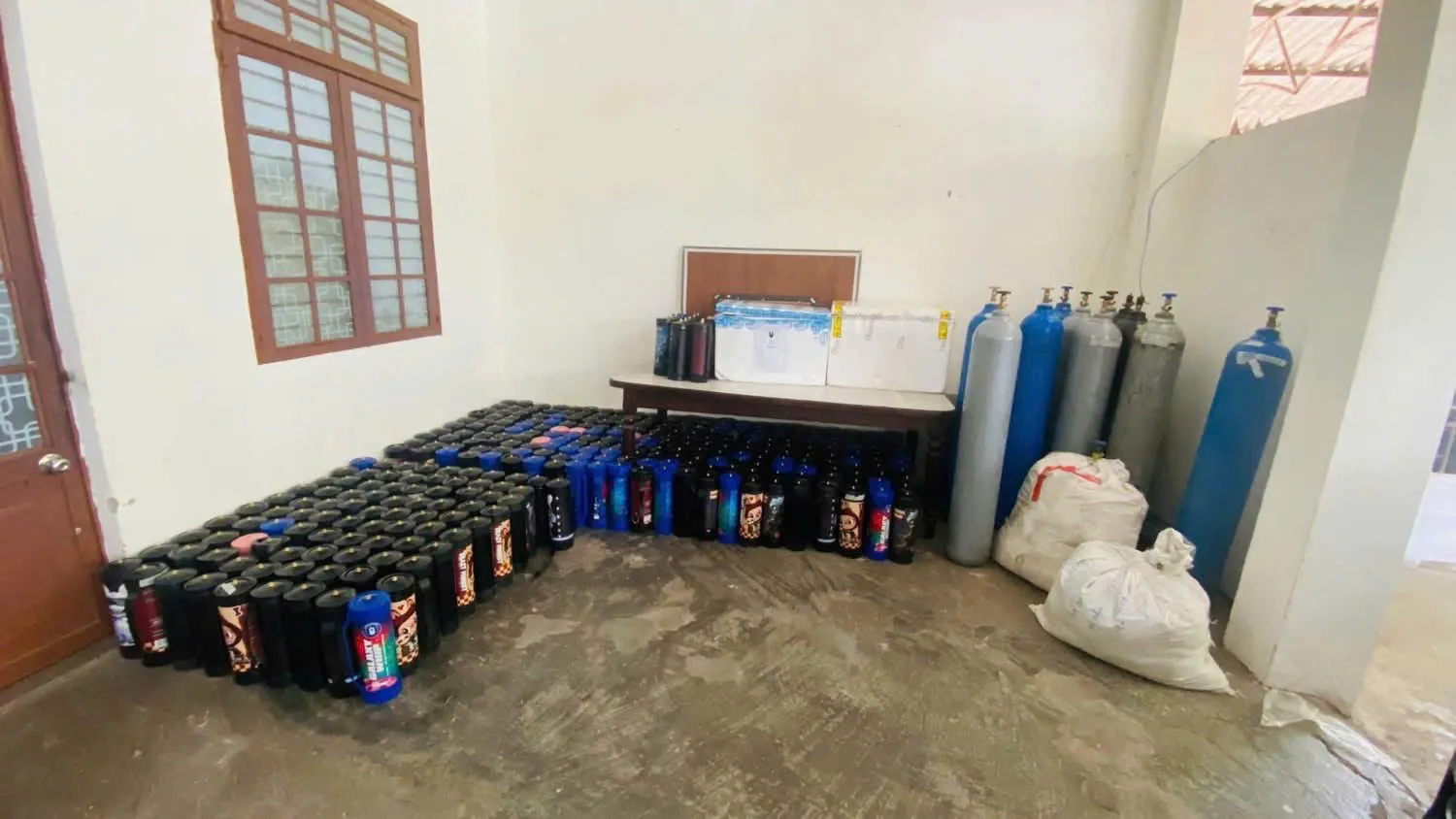 Không dừng lại ở đó, khi kiểm tra kho hàng, Công an tiếp tục phát hiện hàng chục chai rượu mang nhãn mác nước ngoài, hơn 350 bình kim loại chứa khí N2O (khí cười) cùng nhiều dụng cụ sử dụng shisha, bóng cười. Phần lớn số hàng hóa không có giấy tờ chứng minh nguồn gốc xuất xứ, trong đó có mặt hàng thuộc danh mục cấm.