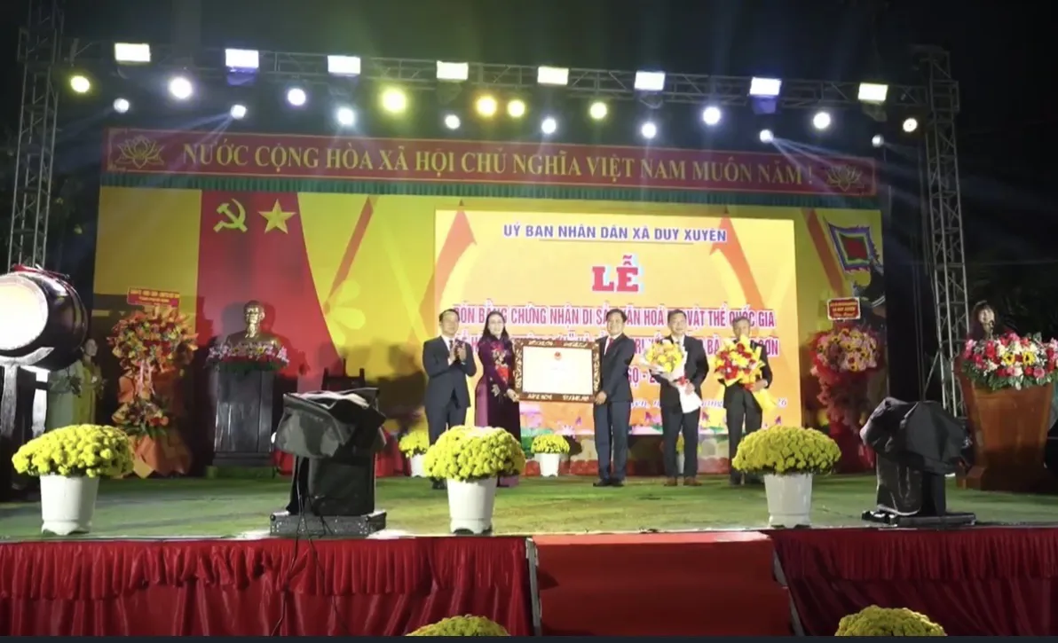 Tại buổi lễ, Phó Bí thư Thường trực Thành ủy Đà Nẵng Nguyễn Đình Vĩnh và Phó Chủ tịch UBND thành phố Đà Nẵng Nguyễn Thị Anh Thi đã trao Bằng chứng nhận Di sản văn hóa phi vật thể quốc gia cho lãnh đạo UBND xã Duy Xuyên.