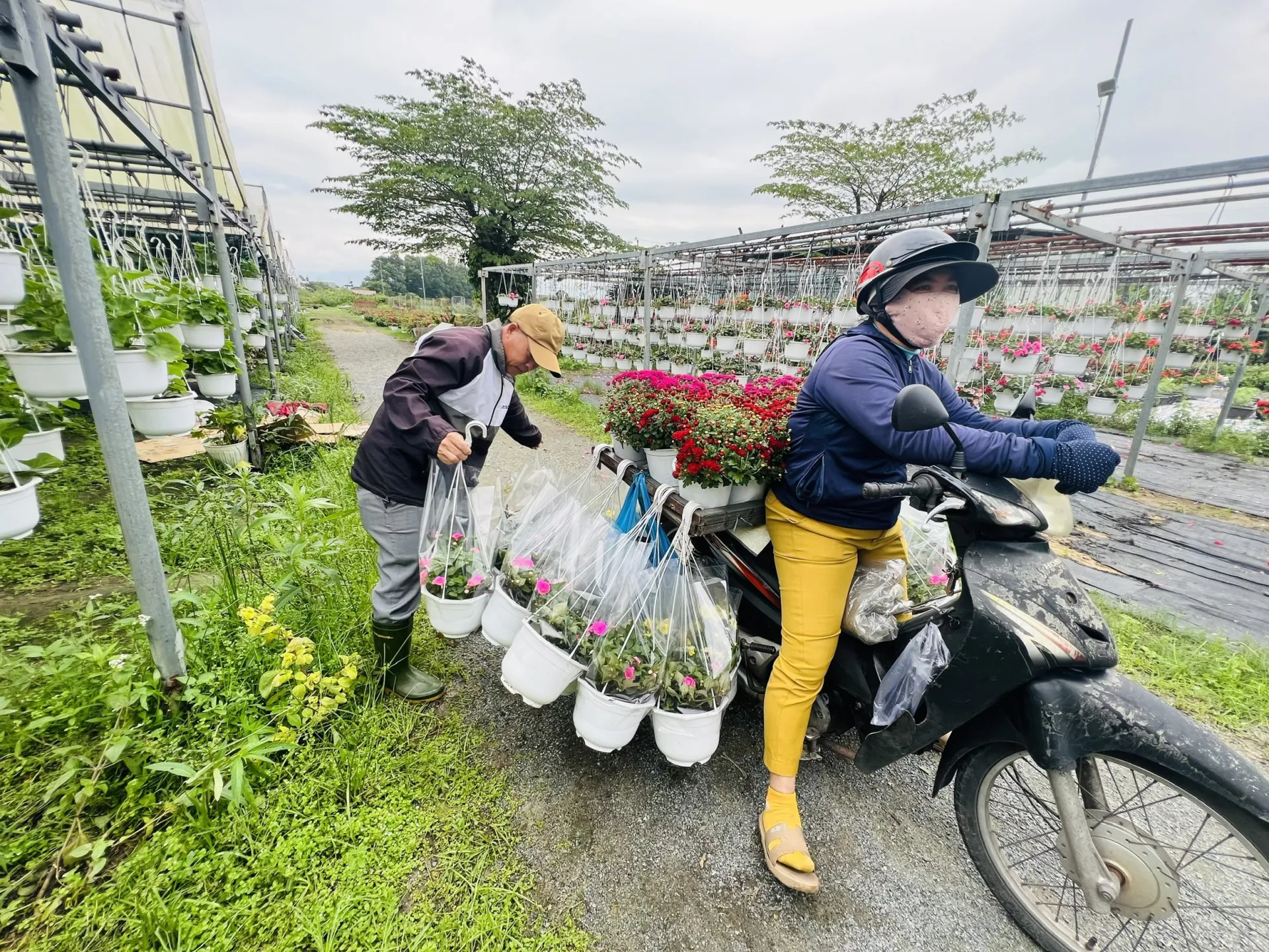 Vườn hoa của anh Thái Văn Công bắt đầu xuất cây đi khắp các cửa hàng. Mỗi chuyến xe máy, vợ chồng anh có thể chở được 40-50 chậu hoa các loại khác nhau.