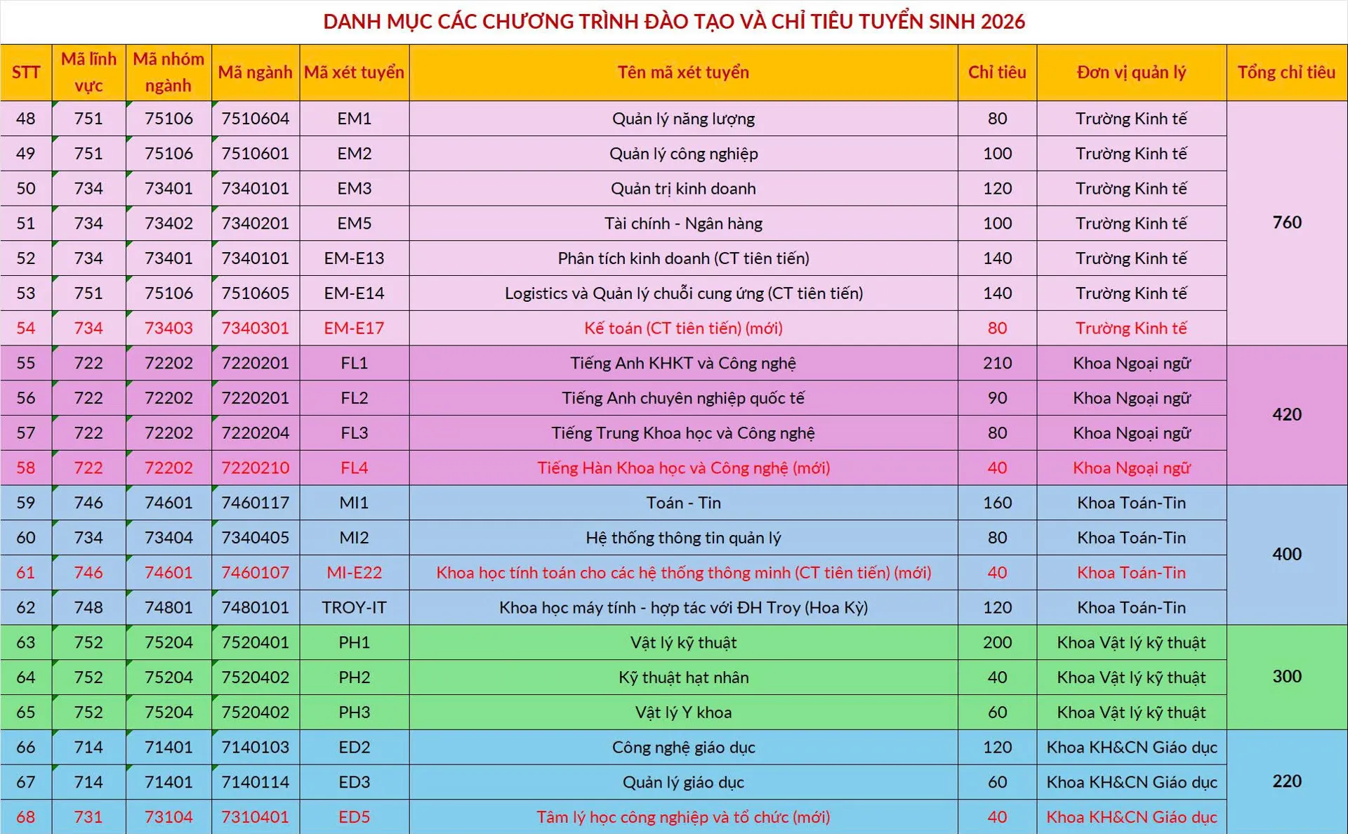 Kinhtedothi - Năm 2026, Đại học Bách khoa Hà Nội dự kiến tuyển sinh 68 chương trình đào tạo, gồm 38 chương trình chuẩn, 26 chương trình chất lượng cao, 2 chương trình Việt Pháp, 2 chương trình liên kết quốc tế; trong đó có 5 chương trình mới.
