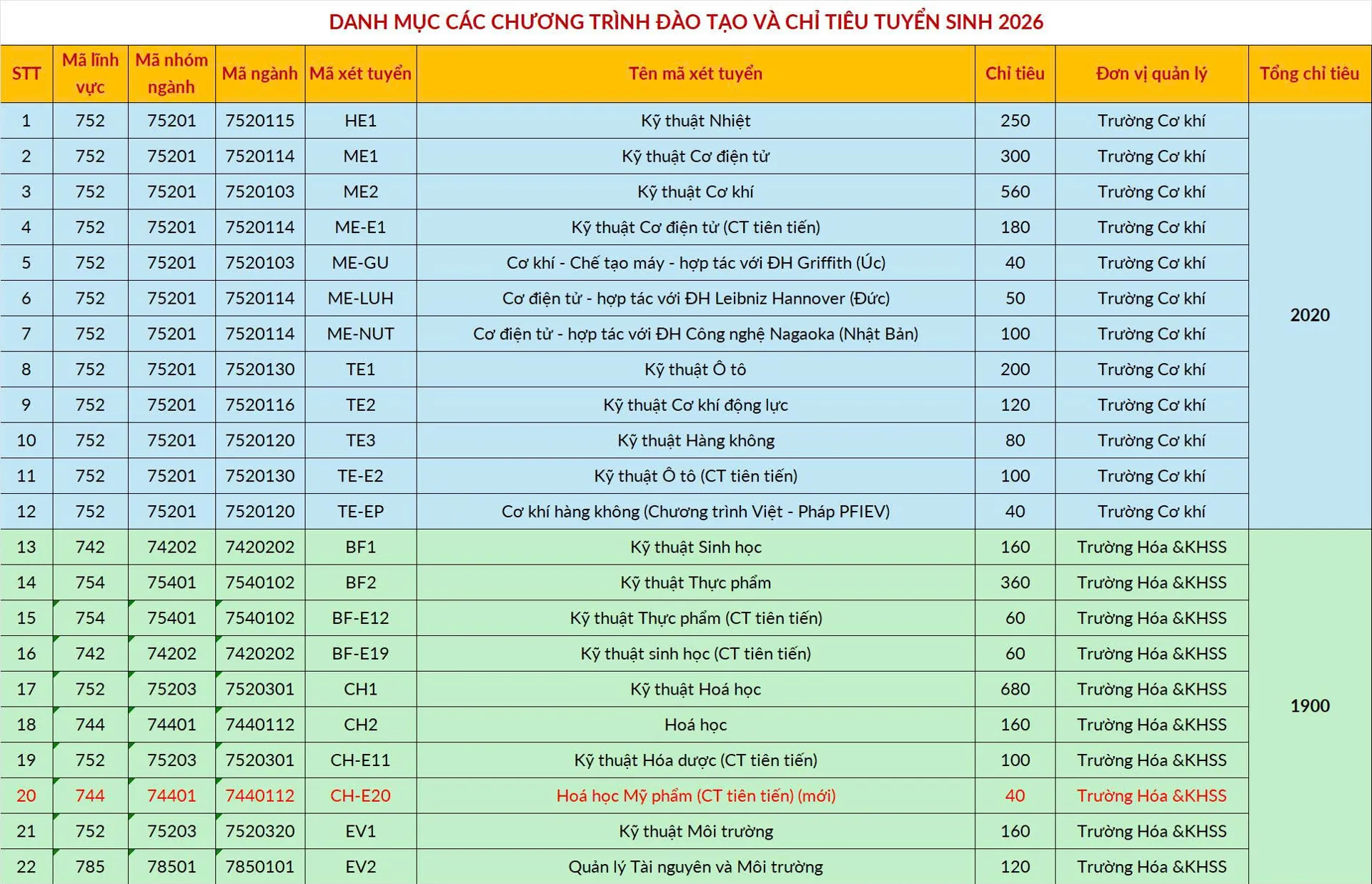 Năm 2026, Đại học Bách khoa Hà Nội dự kiến tuyển sinh 68 chương trình đào tạo, trong đó có 5 chương trình đào tạo mới: Tâm lý học công nghiệp và tổ chức, Tiếng Hàn KH&CN, Hóa học mỹ phẩm, Kế toán, Khoa học tính toán cho các hệ thống thông minh.