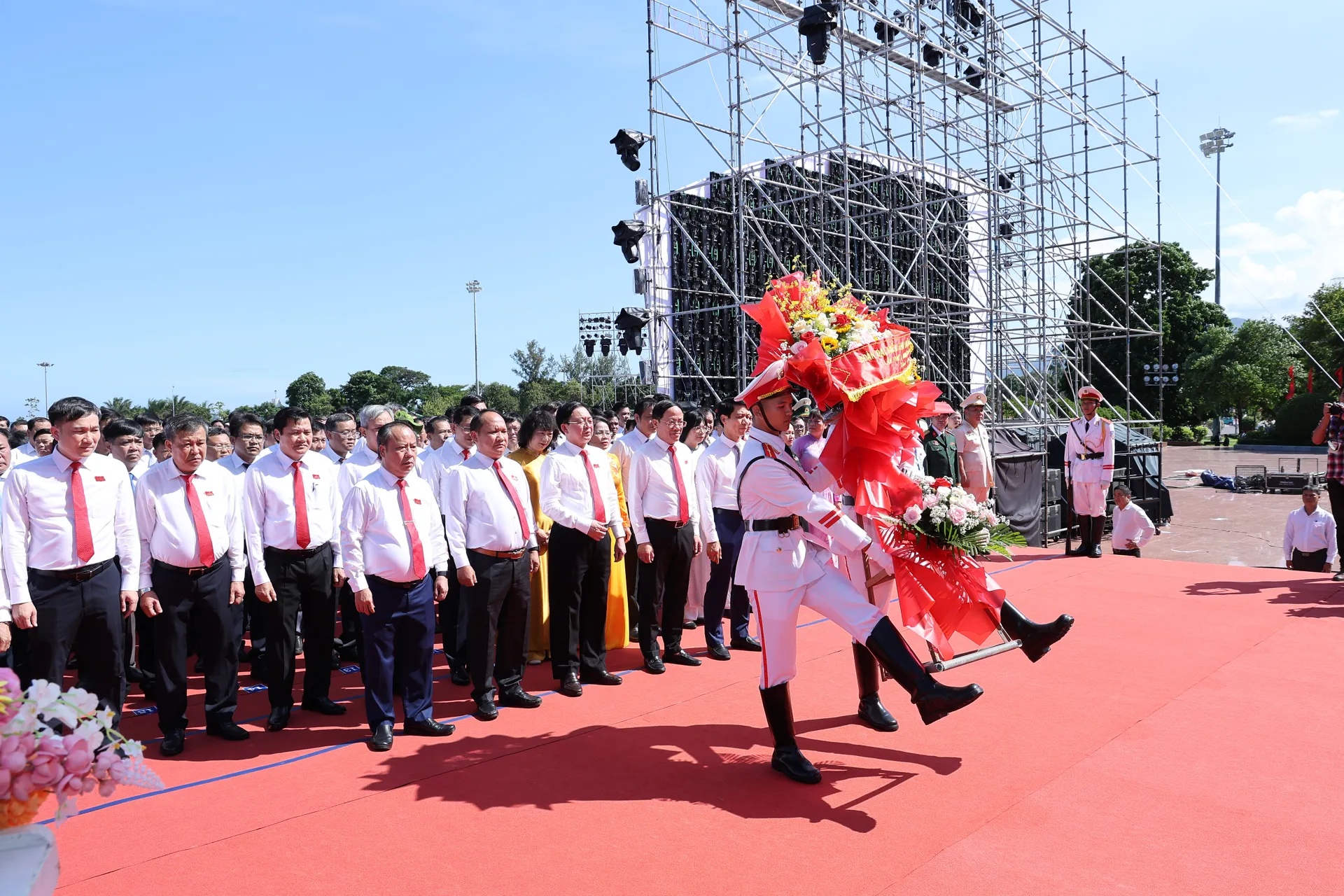Các đại biểu dâng hoa tại Tượng đài Nguyễn Sinh Sắc - Nguyễn Tất Thành (Quảng trường Nguyễn Tất Thành, phường Quy Nhơn).