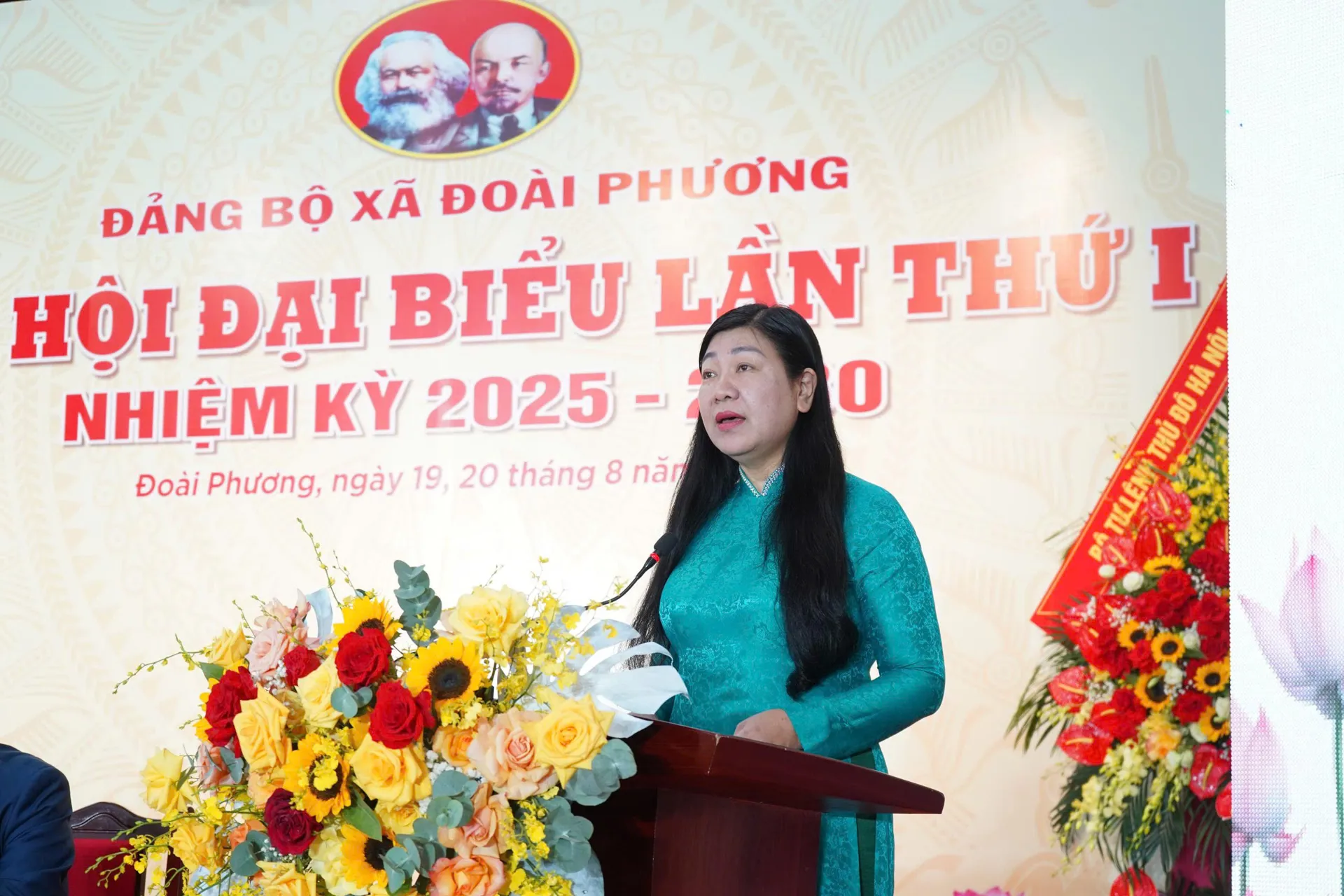 Phát biểu chỉ đạo đại hội, Ủy viên Ban Thường vụ Thành ủy, Chủ tịch Ủy ban MTTQ TP Nguyễn Lan Hương chúc mừng và đánh giá cao công tác chuẩn bị Đại hội của Đảng bộ xã Đoài Phương đồng thời bày tỏ sự đồng tình với các mục tiêu, nhiệm vụ trọng tâm, các khâu đột phá và giải pháp chủ yếu giai đoạn 2025 – 2030 trong dự thảo Báo cáo Chính trị đã đề ra. Để thực hiện thắng lợi Nghị quyết Đại hội Đảng bộ xã lần thứ I, đồng chí Nguyễn Lan Hương nhấn mạnh một số nhiệm vụ trọng tâm Đảng bộ xã Đoài Phương cần triển khai thực hiện trong thời gian tới gồm: