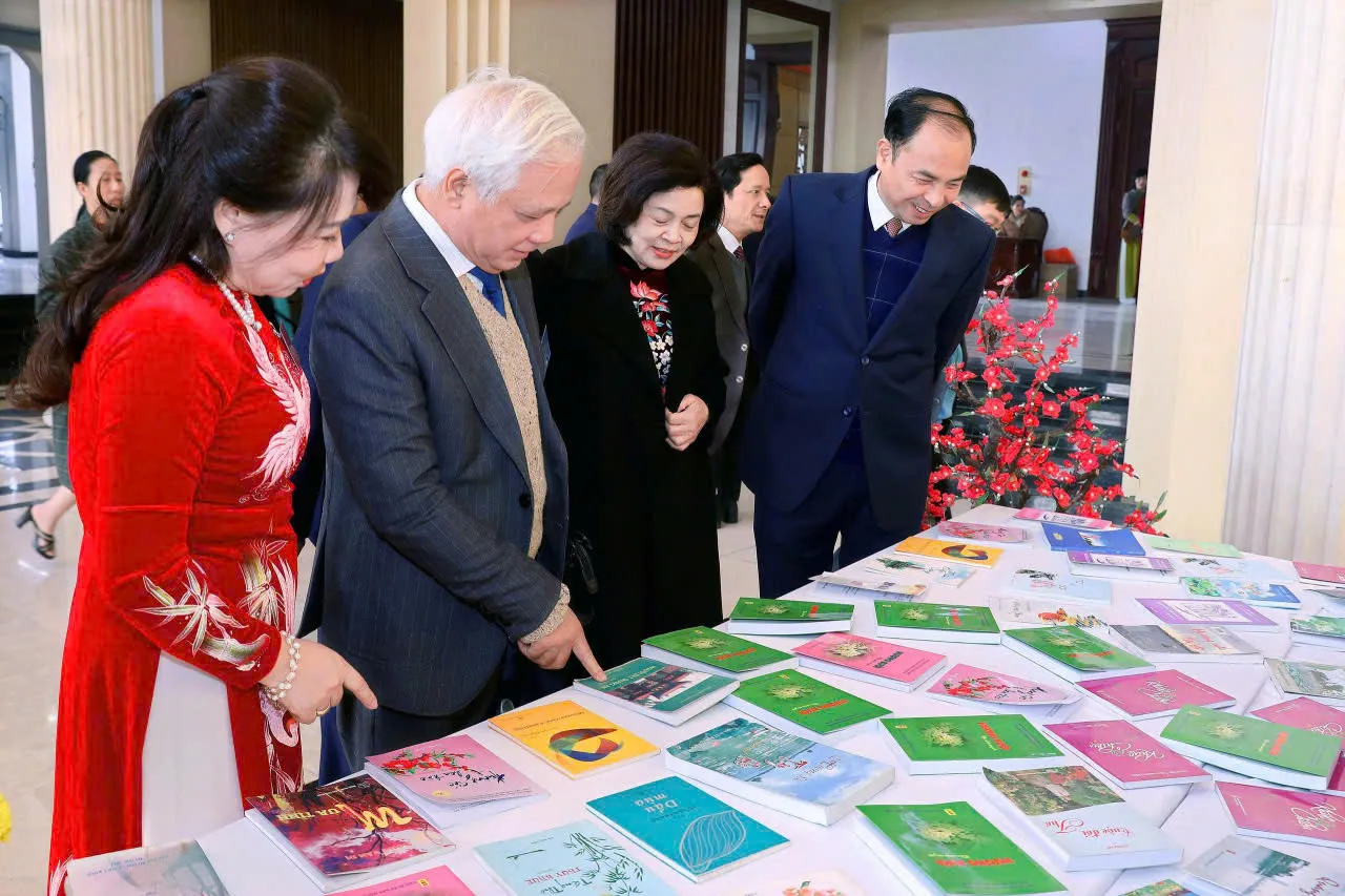 Chủ tịch Hội NCT TP Hà Nội Nguyễn Thế Toàn và Bí thư Đảng uỷ, Chủ tịch HĐND phường Tây Hồ tham quan triển lãm thơ của CLB thơ Người cao tuổi phường Tây Hồ.