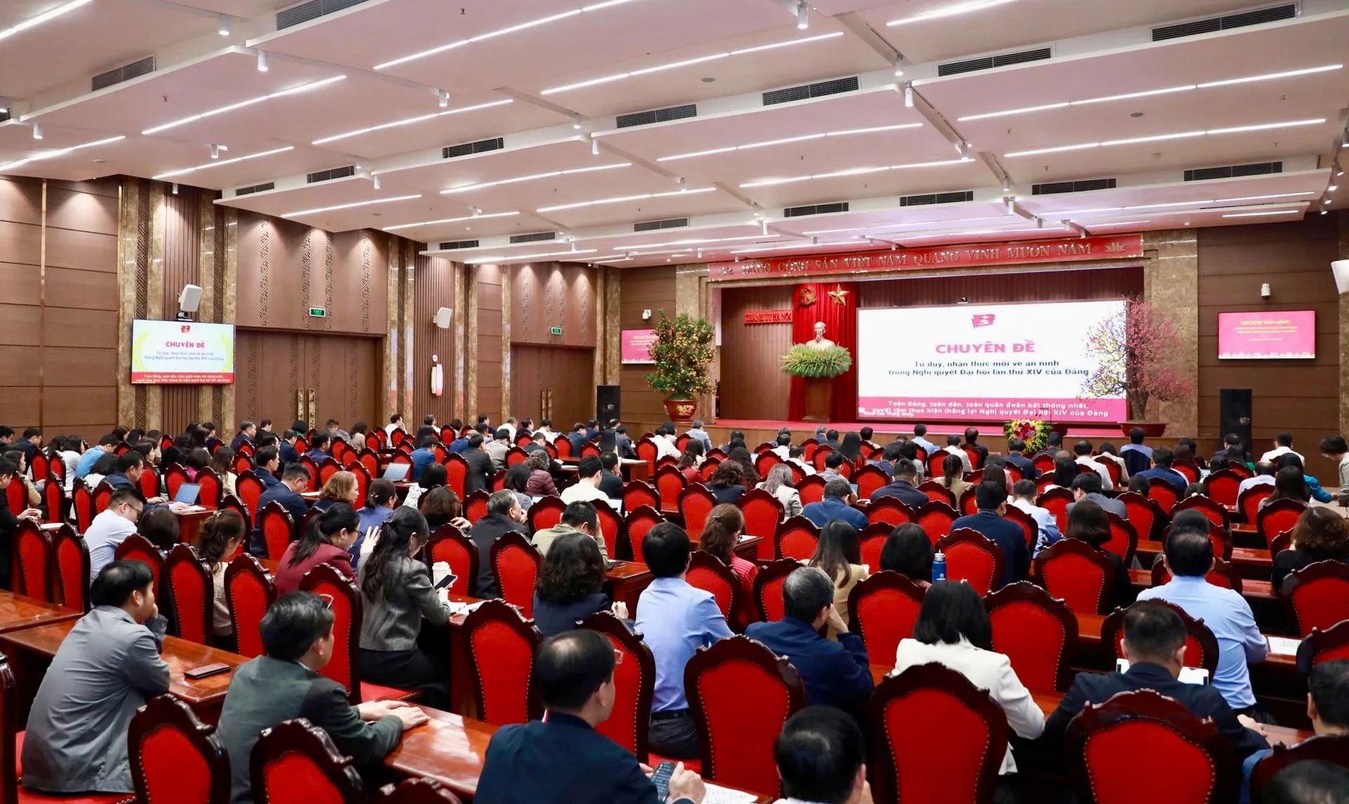 Tổng Bí thư Tô Lâm và các đồng chí lãnh đạo, nguyên lãnh đạo Đảng, Nhà nước tại Hội nghị toàn quốc nghiên cứu, học tập, quán triệt và triển khai thực hiện Nghị quyết Đại hội XIV của Đảng.