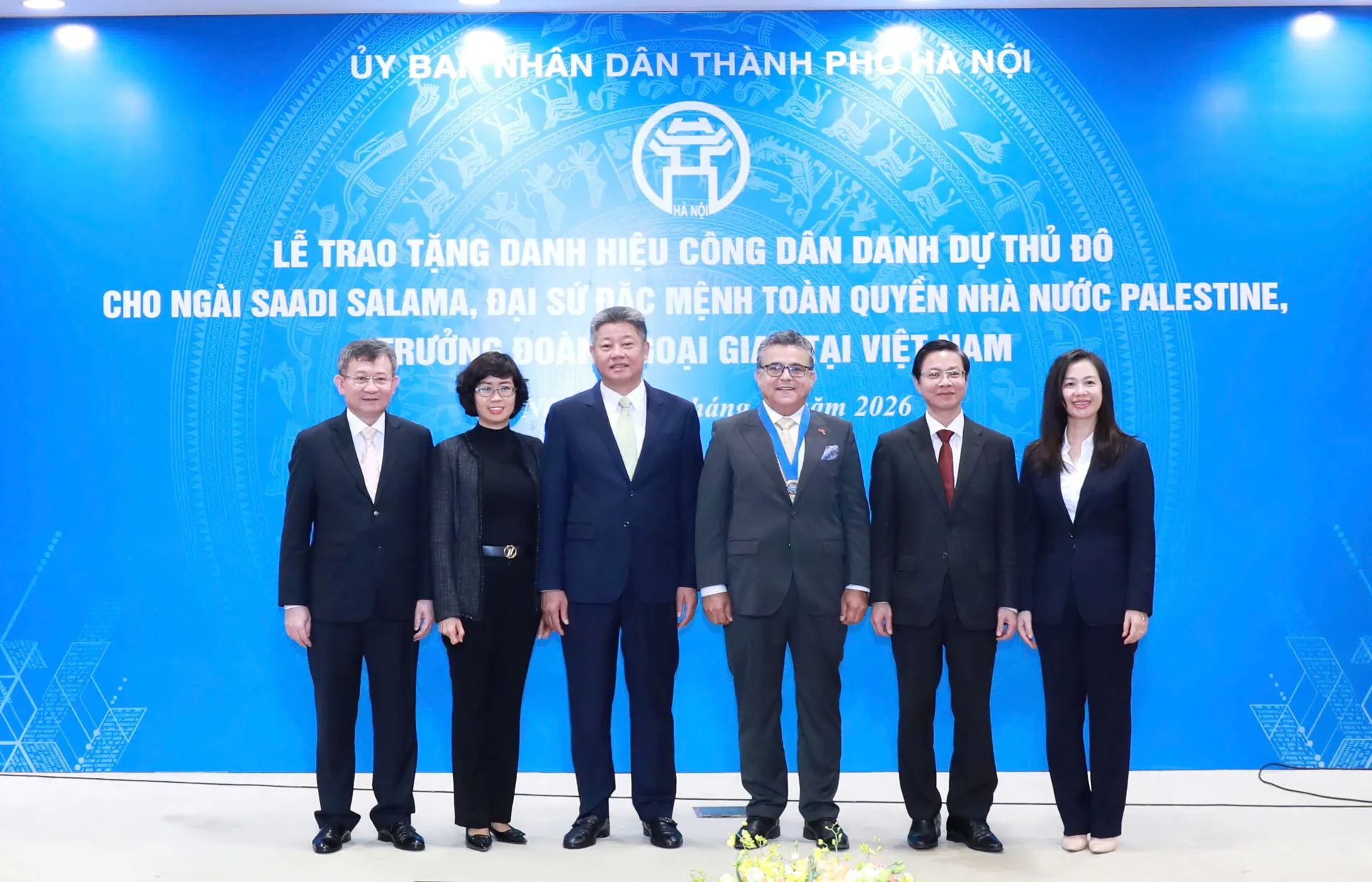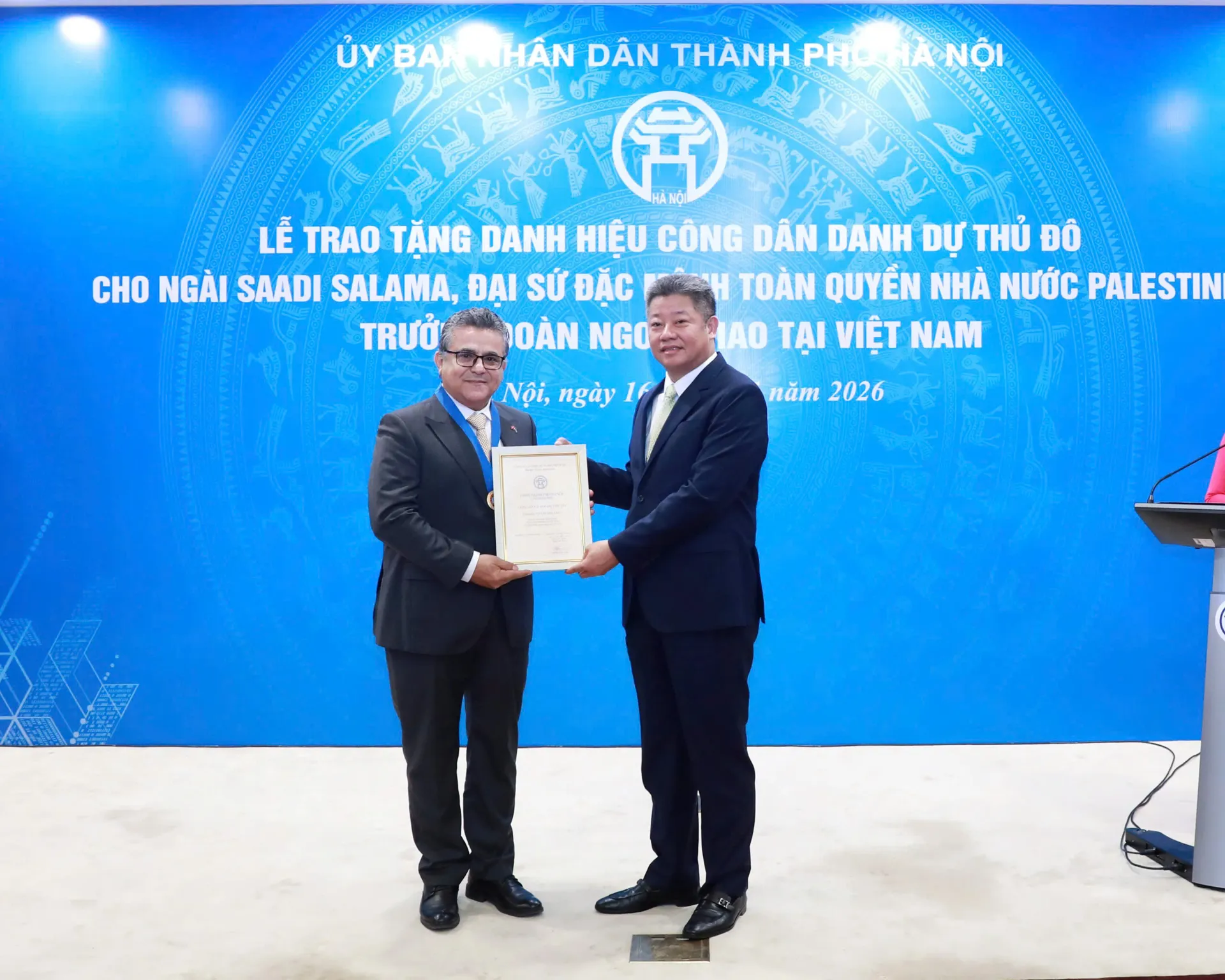 Ngày 16/1, đã diễn ra Lễ trao tặng danh hiệu Công dân danh dự Thủ đô Hà Nội cho ngài Saadi Salama, Đại sứ Nhà nước Palestine, Trưởng đoàn ngoại giao nước ngoài tại Việt Nam.