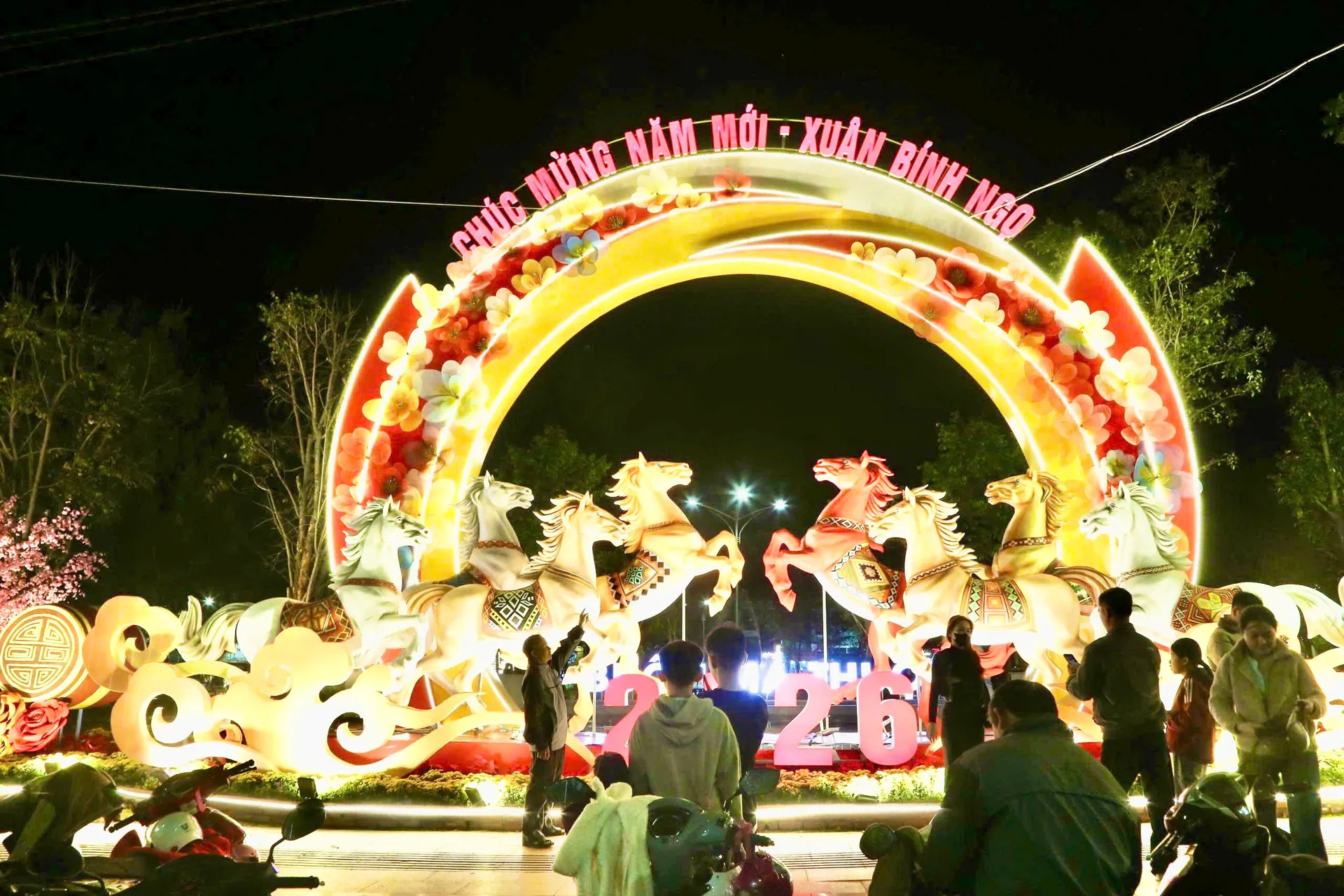 Người dân và du khách check- in tại tiểu cảnh chào mừng năm mới Bính Ngọ.