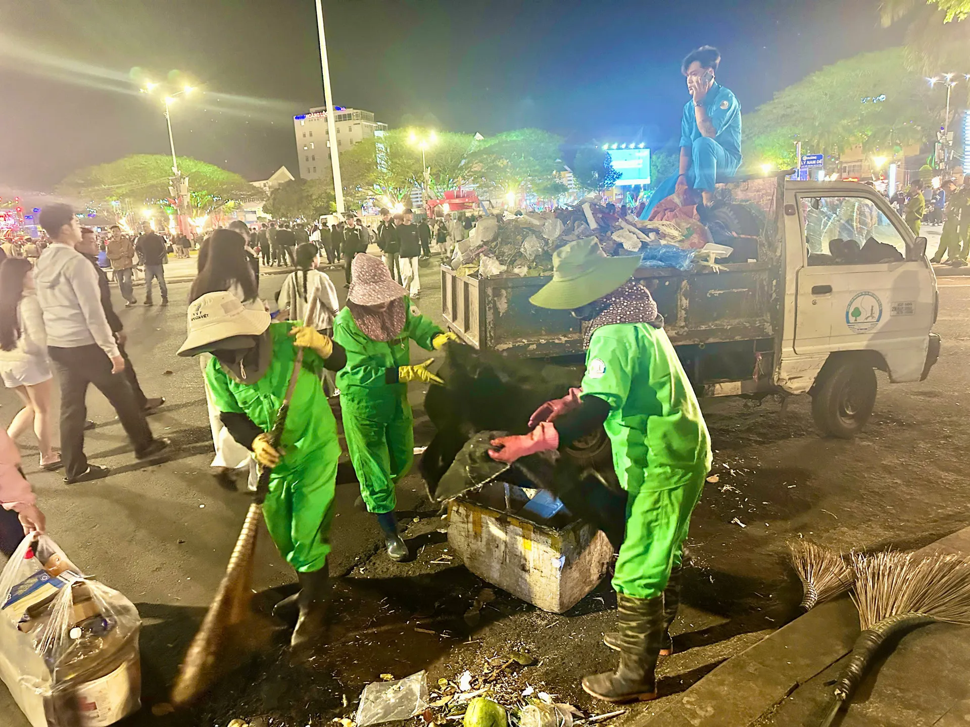 Giữa không khí hân hoan của dòng người đi hội, có những bóng áo xanh, áo cam vẫn miệt mài làm việc. Đó là các công nhân vệ sinh môi trường – những người thầm lặng giữ cho diện mạo đô thị luôn sạch đẹp để đón Tết.