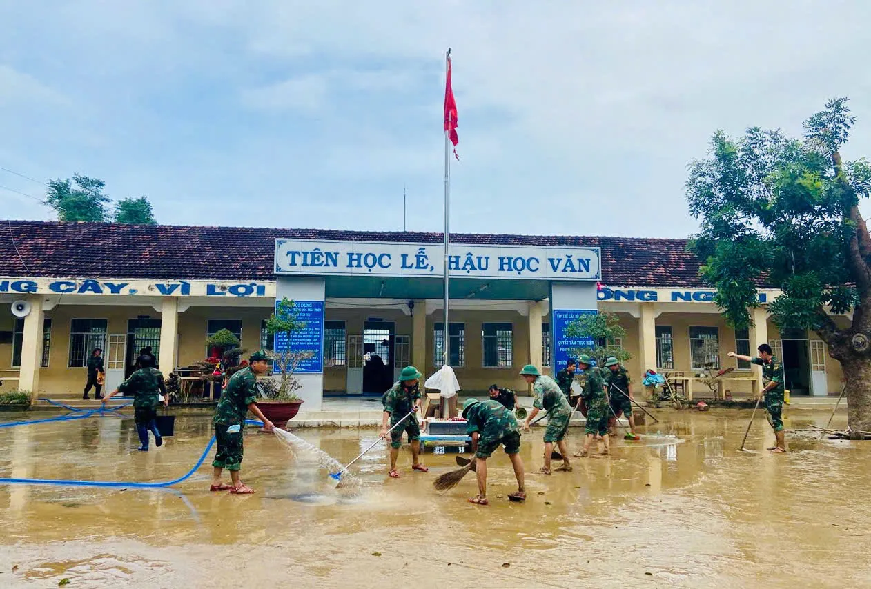 Bộ đội Trung đoàn 143, Sư đoàn 315 giúp Trường tiểu học Hòa Thịnh dọn dẹp sau lũ.
