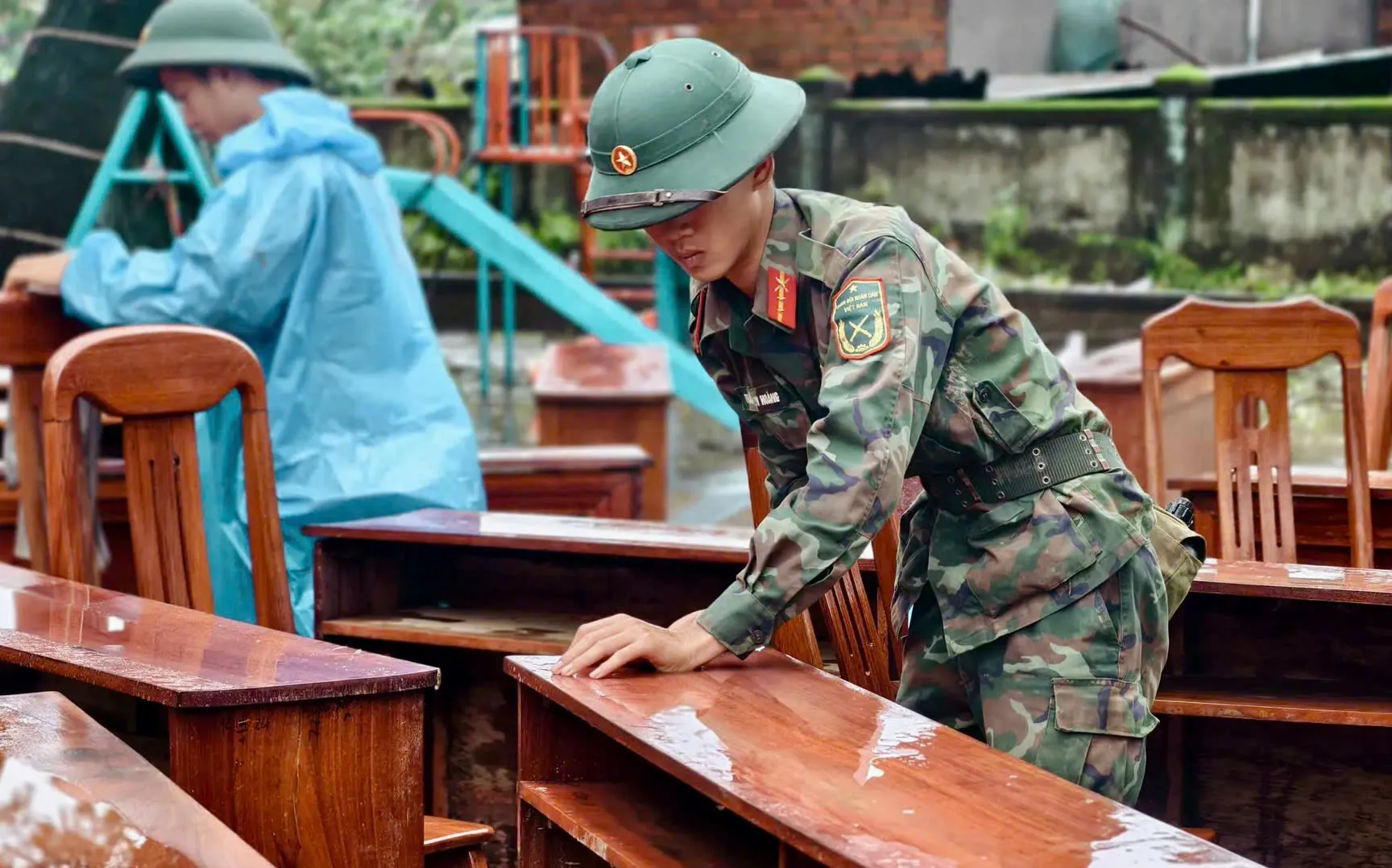 Công tác dọn dẹp trường học là một nhiệm vụ trọng tâm khác của bộ đội. Tại các điểm trường ở Hòa Tâm, Tây Hòa, phường Đông Hòa, màu xanh áo lính của Trung đoàn 143, Sư 315; Sư đoàn 307 (Quân khu 5); Trung đoàn 66, Sư đoàn 10 (Quân đoàn 34) lấm lem bùn đất, làm việc xuyên ngày không ngơi nghỉ.