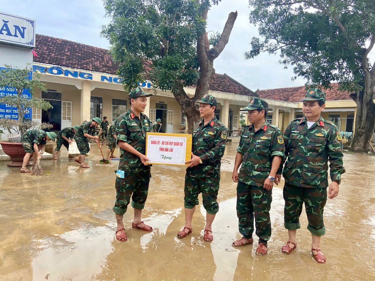 Bộ đội Lữ đoàn 575, Quân khu 5 khắc phục bùn đất tại trường học thuộc phường Đông Hòa.