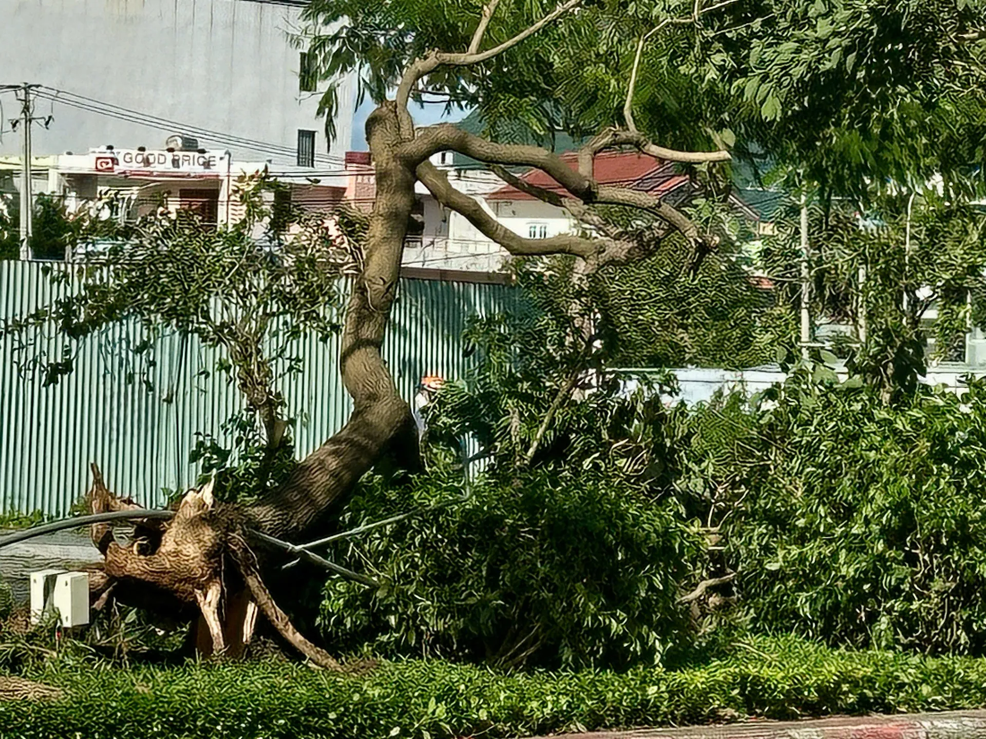 Nhiều thân cây lớn bị bật gốc và gãy ngang thân.