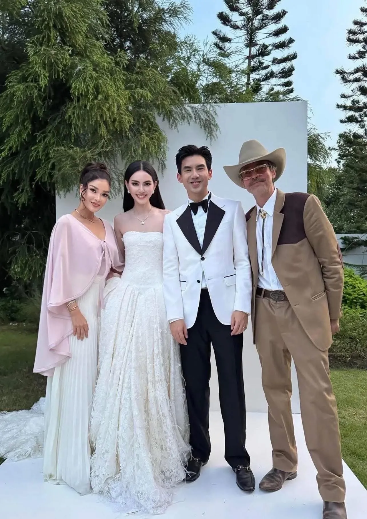 Không gian cưới được bài trí ngoài trời, phủ ngập sắc trắng của hoa hồng, lan và tú cầu, điểm xuyết những mảng xanh lá nhẹ nhàng. Dưới ánh nắng chiều vàng rực, khung cảnh như một bức tranh cổ tích sống động. Cô dâu Mai Davika rạng rỡ trong chiếc váy cưới cúp ngực ôm sát, mái tóc búi cao tôn gương mặt thanh tú, còn chú rể Ter Chantavit lịch thiệp trong bộ vest trắng cùng tông.