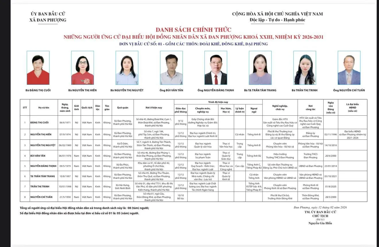 Kinhtedothi - Sau các hội nghị hiệp thương, Ủy ban Bầu cử xã Đan Phượng công bố danh sách 39 người ứng cử đại biểu HĐND xã nhiệm kỳ 2026 - 2031.