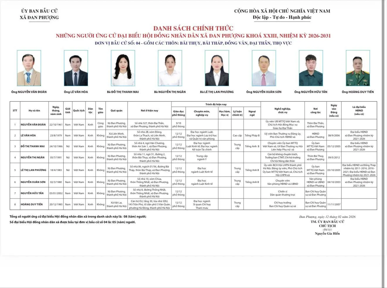 Ủy ban Bầu cử xã Đan Phượng vừa công bố danh sách 39 người ứng cử đại biểu HĐND xã nhiệm kỳ 2026 - 2031 tại 5 đơn vị bầu cử trên địa bàn xã để bầu 24 đại biểu HĐND xã khóa mới.
