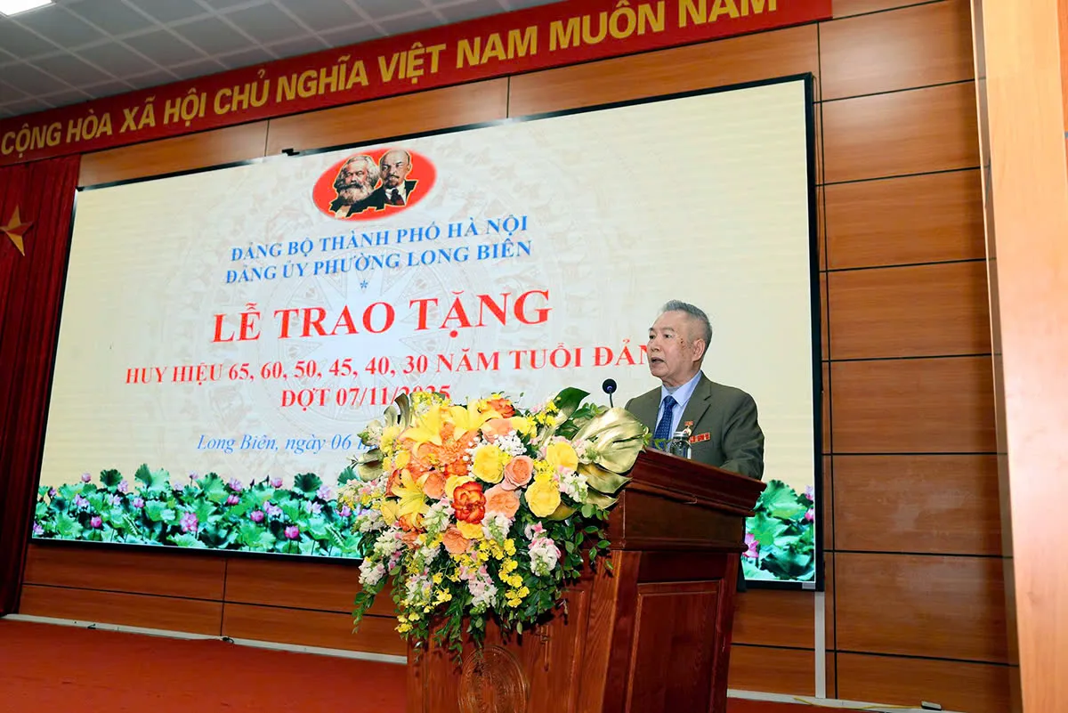 Đồng chí Bí thư nhấn mạnh, Lễ trao tặng Huy hiệu Đảng diễn ra đúng vào dịp cả nước kỷ niệm 108 năm Cách mạng Tháng Mười Nga vĩ đại (7/11/1917 - 7/11/2025), sự kiện mở ra kỷ nguyên mới cho nhân loại. Đồng chí khẳng định, qua 40 năm đổi mới, đất nước ta đã đạt được những thành tựu to lớn, như Đại hội XIII của Đảng đã nhận định: "Đất nước ta chưa bao giờ có được cơ đồ, tiềm lực, vị thế và uy tín quốc tế như hôm nay". Bày tỏ lòng biết ơn sâu sắc, ghi nhận các đảng viên lão thành, dù tuổi cao, sức khỏe giảm sút, vẫn luôn là những "tấm gương sáng", Bí thư Đảng ủy phường Long Biên Nguyễn Mạnh Hà mong muốn các đồng chí đảng viên tiếp tục đóng góp trí tuệ và kinh nghiệm, động viên con cháu chấp hành tốt chủ trương của Đảng, pháp luật của Nhà nước, góp phần xây dựng địa phương ngày càng phát triển.