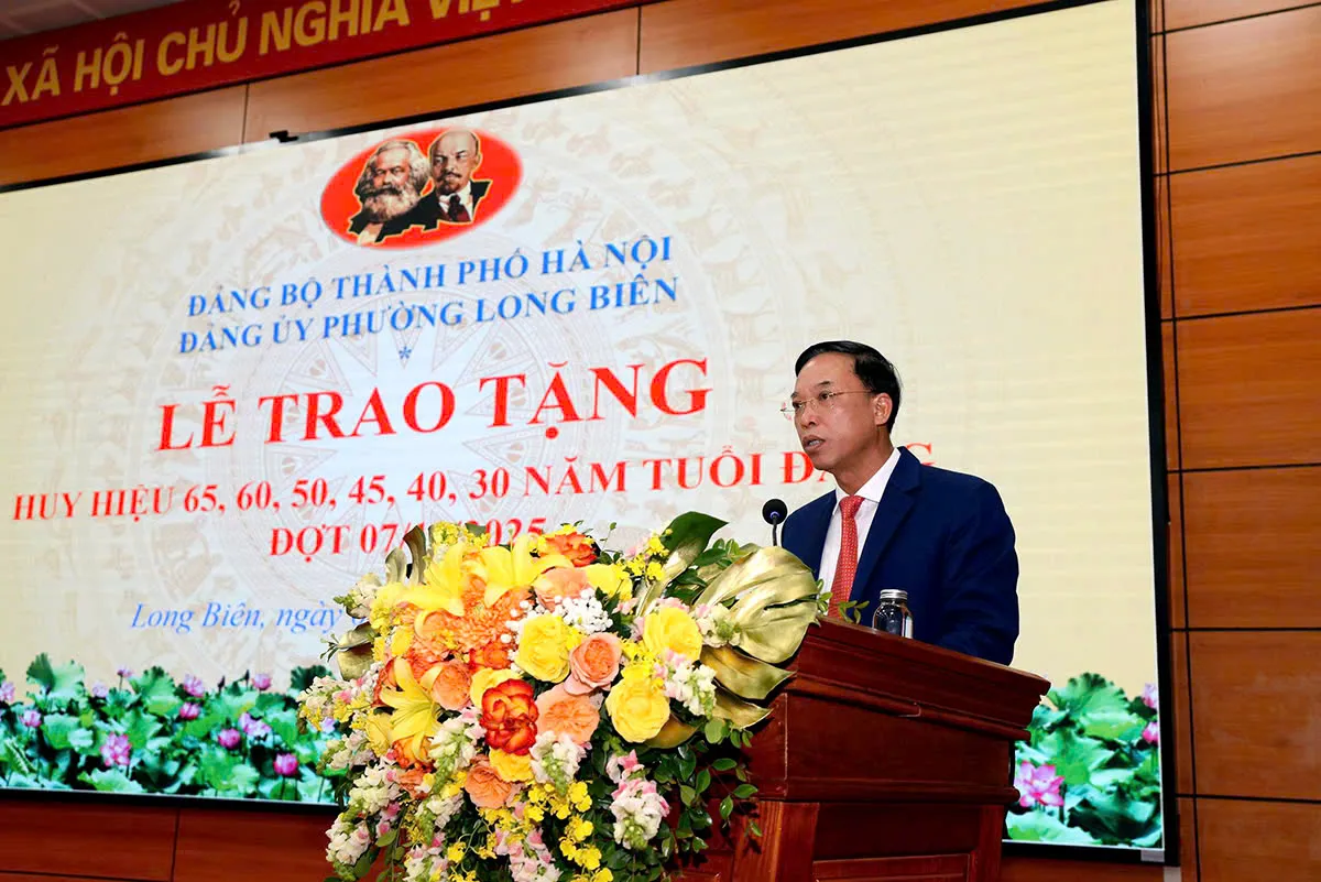 Phát biểu tại buổi lễ, Bí thư Đảng ủy phường Long Biên Nguyễn Mạnh Hà, đã gửi lời chúc mừng nồng nhiệt và bày tỏ sự trân trọng sâu sắc đối với những đóng góp to lớn của các đảng viên được nhận Huy hiệu Đảng.