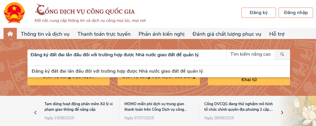 Để thực hiện thủ tục “Đăng ký đất đai lần đầu đối với trường hợp được Nhà nước giao đất để quản lý”, trên Cổng Dịch vụ công Quốc gia.