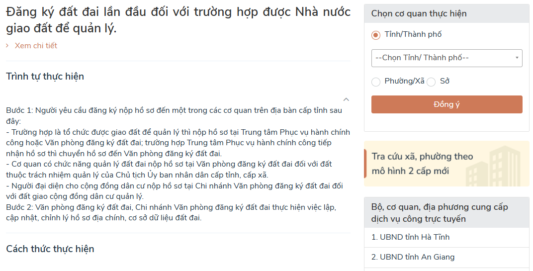 - Công dân nhập từ khóa: “Đăng ký đất đai lần đầu đối với trường hợp được Nhà nước giao đất để quản lý" vào thanh tìm kiếm để tìm thủ tục hành chính