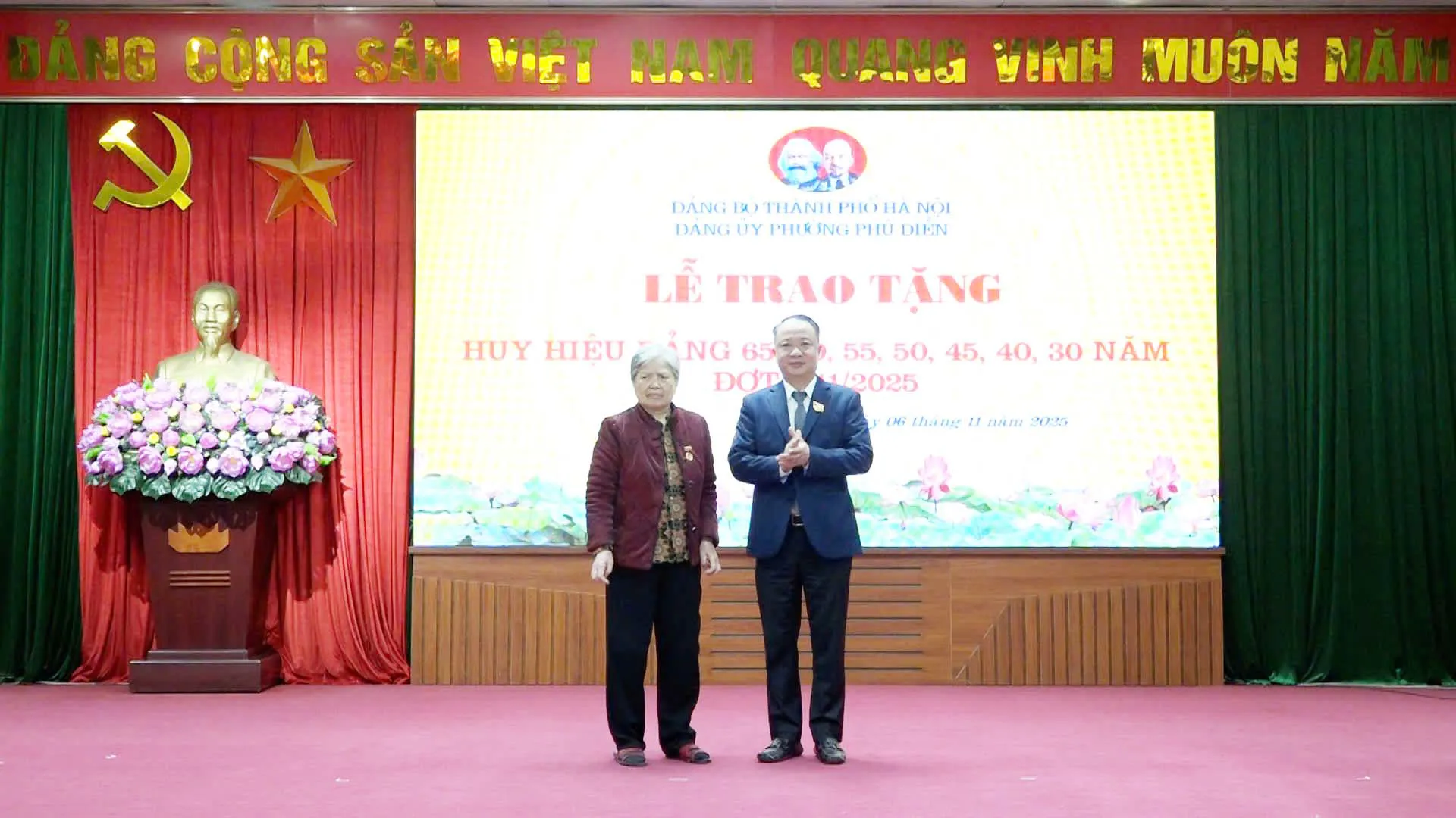 Kinhtedothi - Ngày 6/11, Đảng ủy phường Phú Diễn tổ chức lễ trao tặng Huy hiệu Đảng đợt 7/11/2025 nhân dịp kỷ niệm 108 năm Ngày Cách mạng tháng Mười Nga lịch sử. Tới dự có Bí thư Đảng ủy, Chủ tịch HĐND phường Phú Diễn Nguyễn Lê Hoàng; Phó Bí thư Thường trực Đảng ủy phường Hoàng Thị Thủy, Chủ tịch UBND phường Nguyễn Văn Hải.