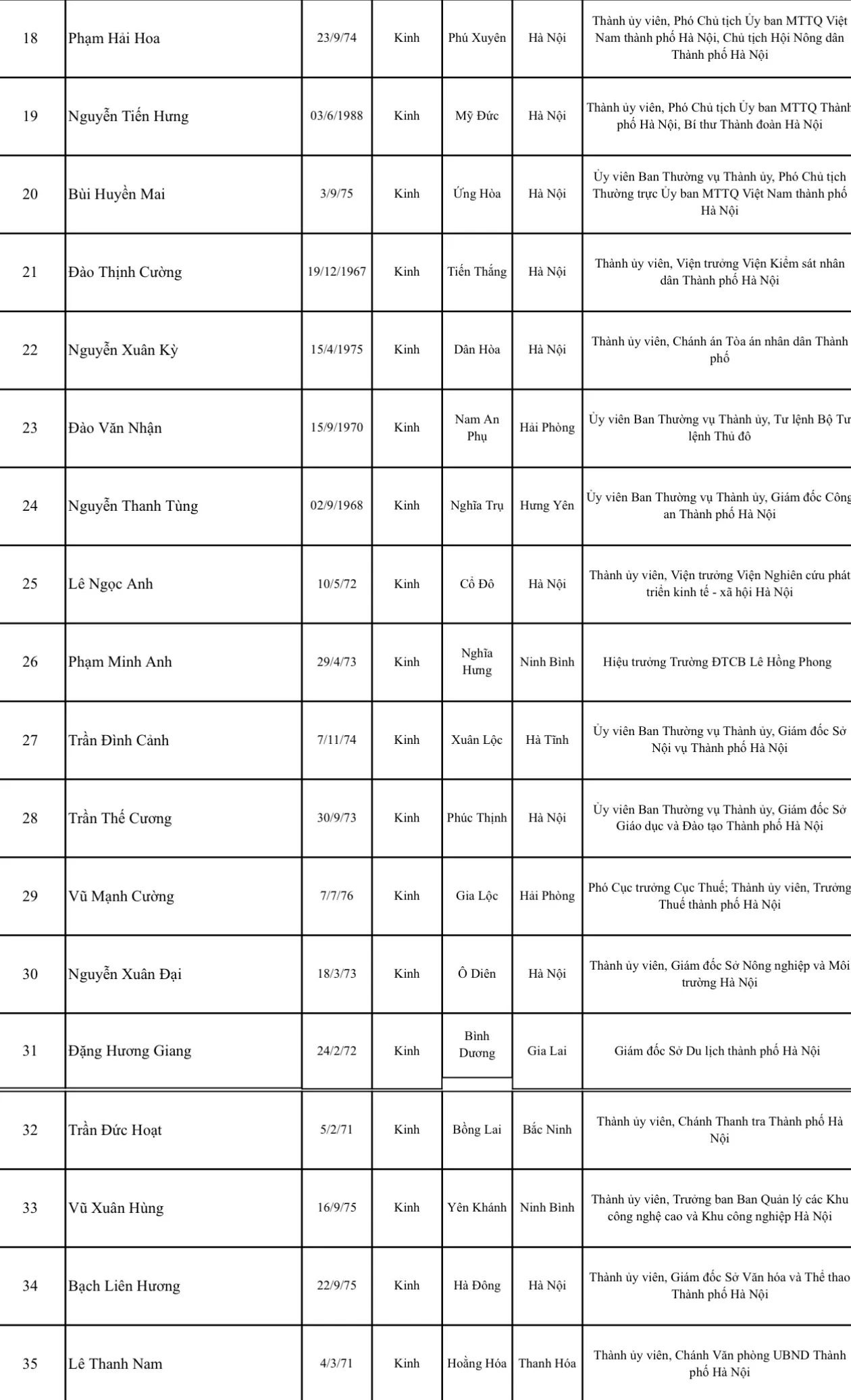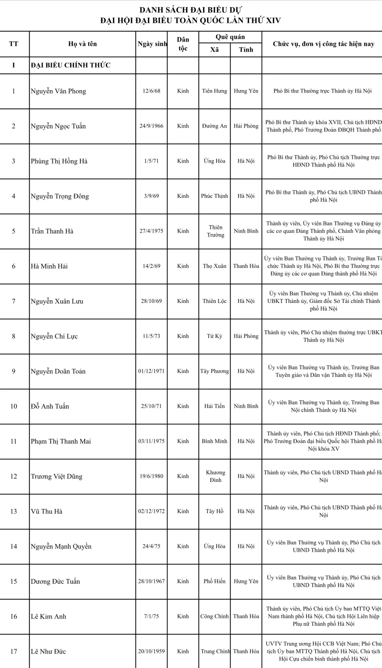 Dưới đây là danh sách đại biểu TP Hà Nội dự Đại hội đại biểu toàn quốc lần thứ XIV của Đảng: