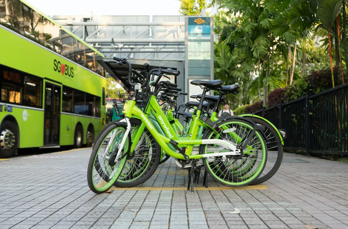 Xe đạp công cộng bên cạnh xe buýt xanh tại Singapore, minh họa mô hình giao thông đô thị đặt hiệu quả và bền vững lên hàng đầu. Ảnh: LovelyPlanet