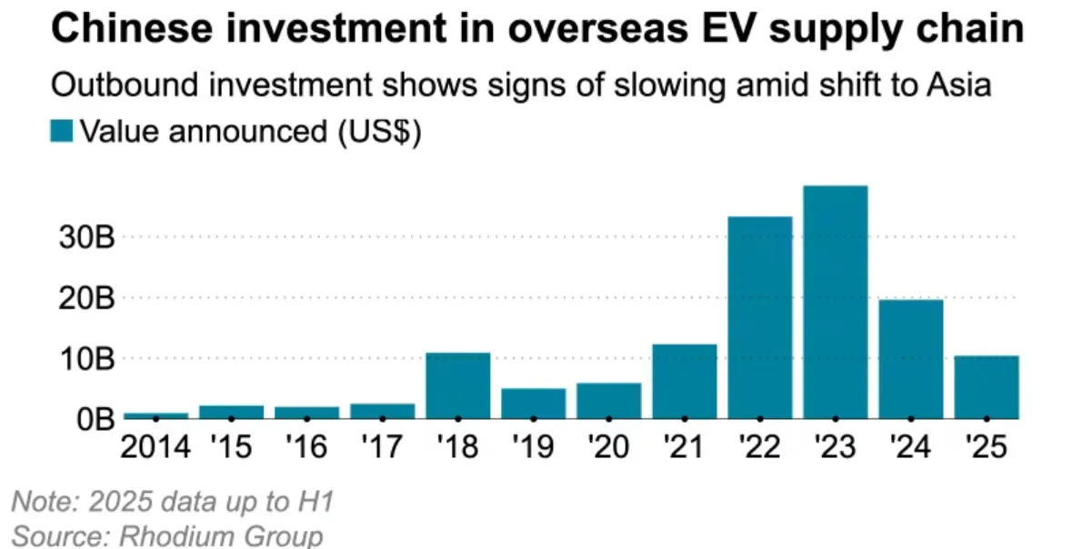 Các biện pháp bảo hộ thương mại từ Mỹ và châu Âu đã thúc đẩy doanh nghiệp Trung Quốc dịch chuyển chuỗi cung ứng ra ngoài lãnh thổ. Châu Âu từng là điểm đến lớn nhất của dòng vốn EV Trung Quốc, nhưng hiện nay các công ty đang tăng đầu tư sang châu Á và Trung Đông.