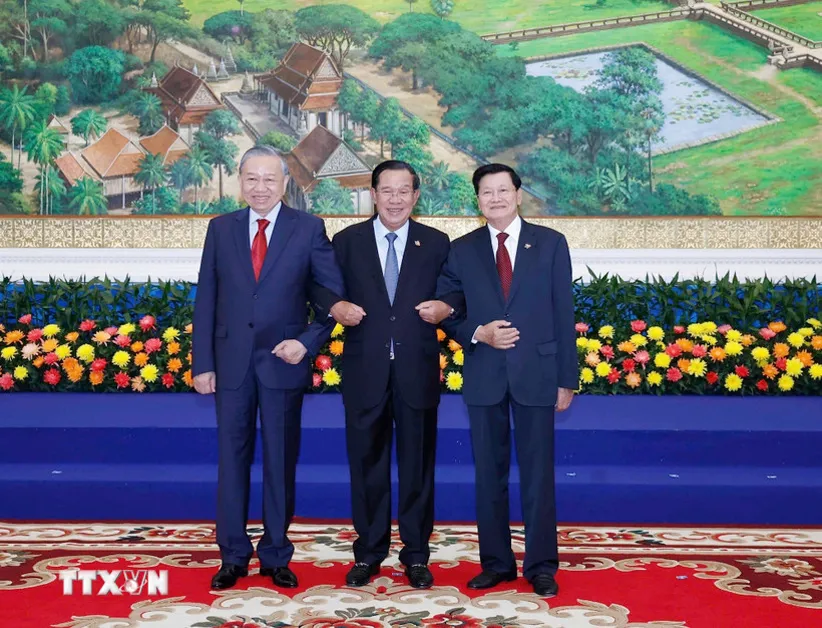 Tổng Bí thư Tô Lâm; Chủ tịch Đảng Nhân dân Campuchia Samdech Techo Hun Sen; Tổng Bí thư Đảng Nhân dân Cách mạng Lào Thongloun Sisoulith tại Cuộc gặp giữa người đứng đầu ba Đảng của Việt Nam, Campuchia và Lào. (Ảnh: Thống Nhất/TTXVN)