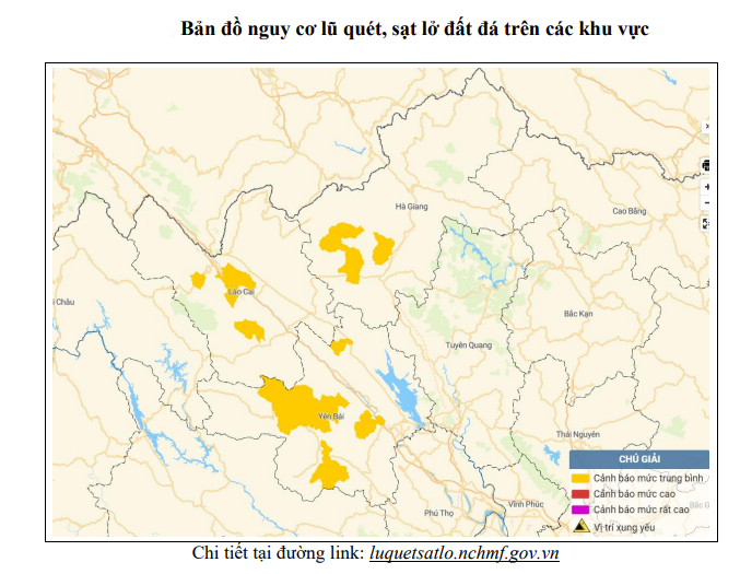 Trong 06 giờ tới, nguy cơ xảy ra lũ quét trên các sông, suối nhỏ, sạt lở đất trên sườn dốc tại các tỉnh trên, đặc biệt tại các huyện: Yên Bái: Văn Yên, Trạm Tấu, Văn Chấn, Mù Cang Chải, Trấn Yên, TX. Nghĩa Lộ, Lục Yên; Lào Cai: TX Sa Pa, Bát Xát, Bảo Yên, Văn Bàn; Hà Giang: Quang Bình, Xín Mần, Bắc Quang, Hoàng Su Phì.